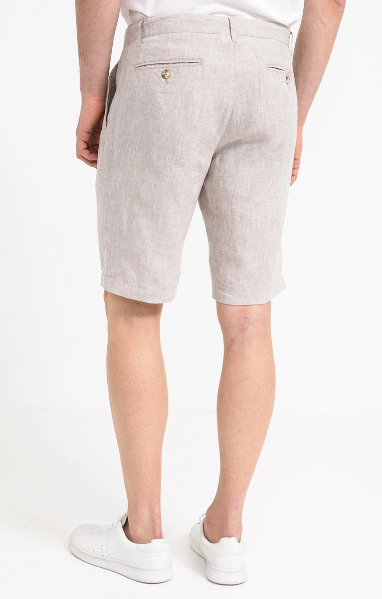 Bermuda uni 100 % lin. Forme droite chino. Fermeture zippée et boutonnée. 2 poches italiennes devant et 2 poches passepoilées et boutonnées au dos. Bermuda confectionné en toile de lin de couleur unie. Coutures ton sur ton. Boutons effet corne. Passants pour ceinture. Composition 100 % lin. Notre mannequin Maxime mesure 1m88 et porte un bermuda taille 42.