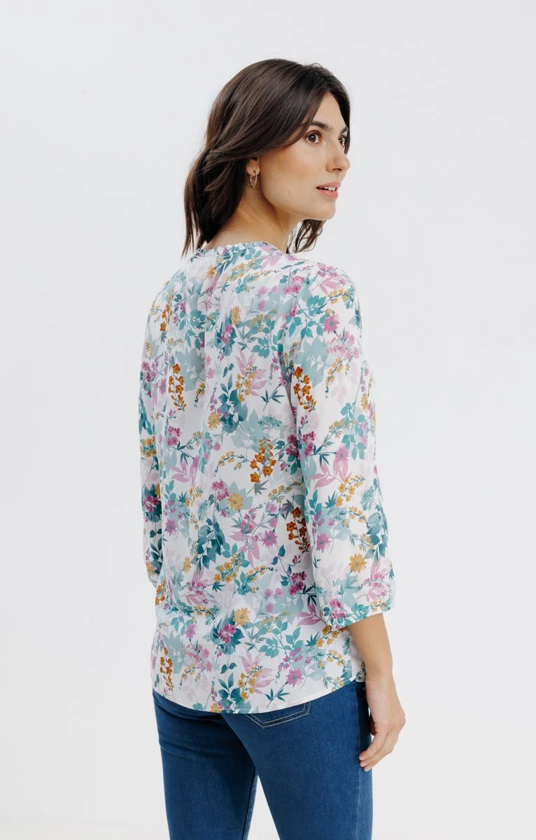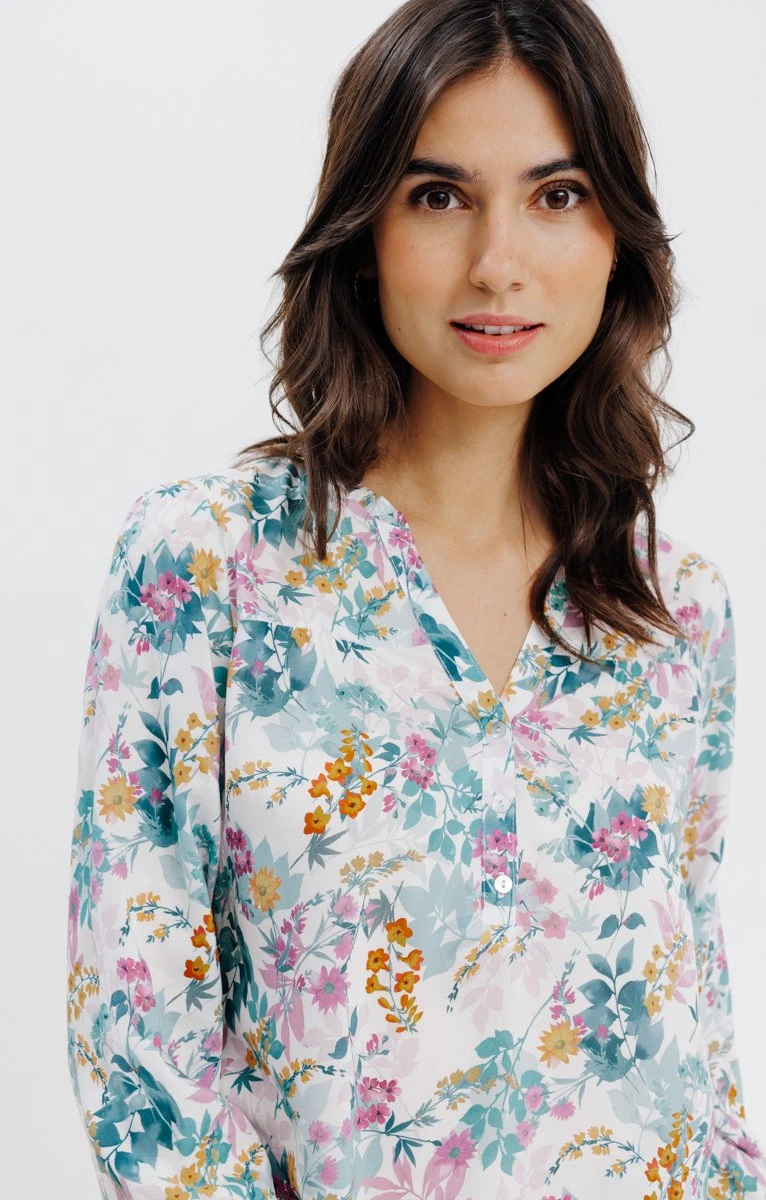 Blouse boutonnée à manches 3/4 élastiquées et imprimé à fleurs multicolores. Coupe droite. Manches 3/4 aux poignets élastiqués. Col rond ouvert sur un décolleté V. Fermeture à boutons en ton sur ton. Fond en teinte unie imprimé de motifs floraux multicolores. Matière fluide. Base en arrondi au dos. Notre mannequin Laura mesure 1m78 et porte une blouse taille 1.