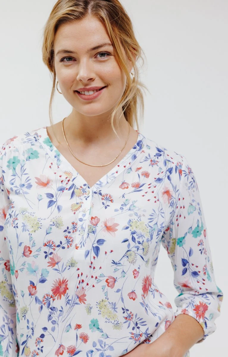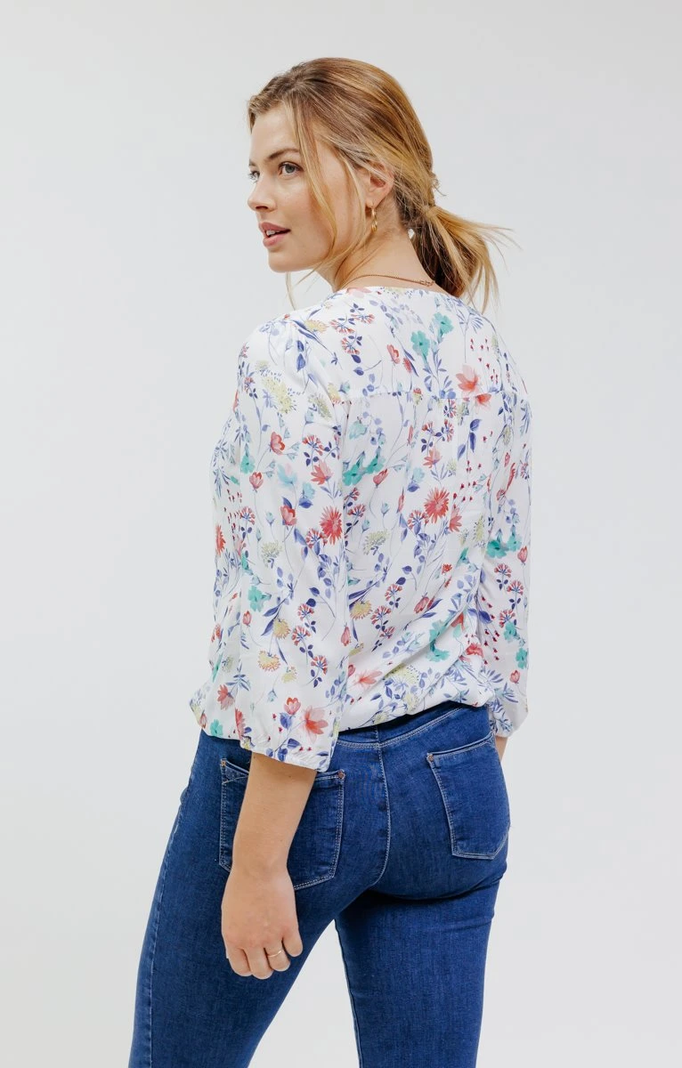 Blouse à fleurs. Coupe droite fluide. Manches 3/4 à emmanchures droites avec poignets élastiqués. Col V. Ouverture par 3 boutons discrets au col. Imprimé à motif petites fleurs et feuilles multicolores sur fond uni, sur l’ensemble du modèle. Découpe au niveau des épaules. Découpe horizontale dans le haut du dos. Notre mannequin Frédérique mesure 1m78 et porte une blouse taille 1.