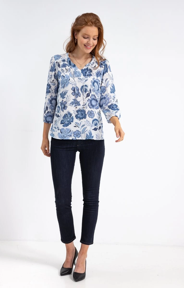 Blouse bicolore à fleurs. Coupe droite fluide. Manches 3/4 avec poignets élastiqués. Col V avec liens. Imprimé à motifs grosses fleurs sur fond uni, sur l’ensemble du modèle. Bicolore. Découpe et fronces sous les épaules. Découpe horizontale et fronces au dos. Perles en finition des liens. Notre mannequin Anna mesure 1m80 et porte une blouse taille 1.