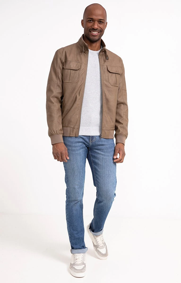 Blouson effet simili avec un col montant à fermeture zippée et une patte de serrage. Bord côte aux poignets et à l’intérieur du col. Ce blouson comporte 4 poches, 2 poches plaquées à fermeture pression sur la poitrine et 2 poches basses à fermeture zippée. A l’intérieur vous trouverez 2 poches à fermeture pression. Notre mannequin Marvin mesure 1m87 et porte un blouson taille M.