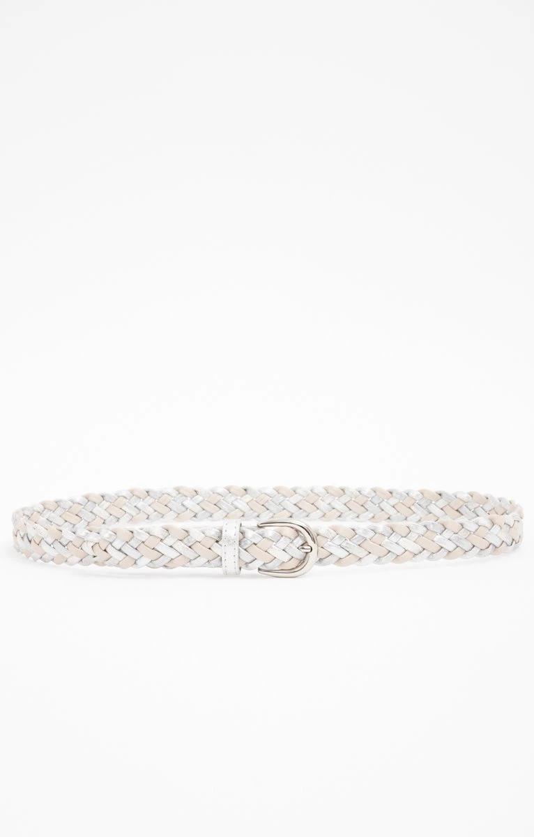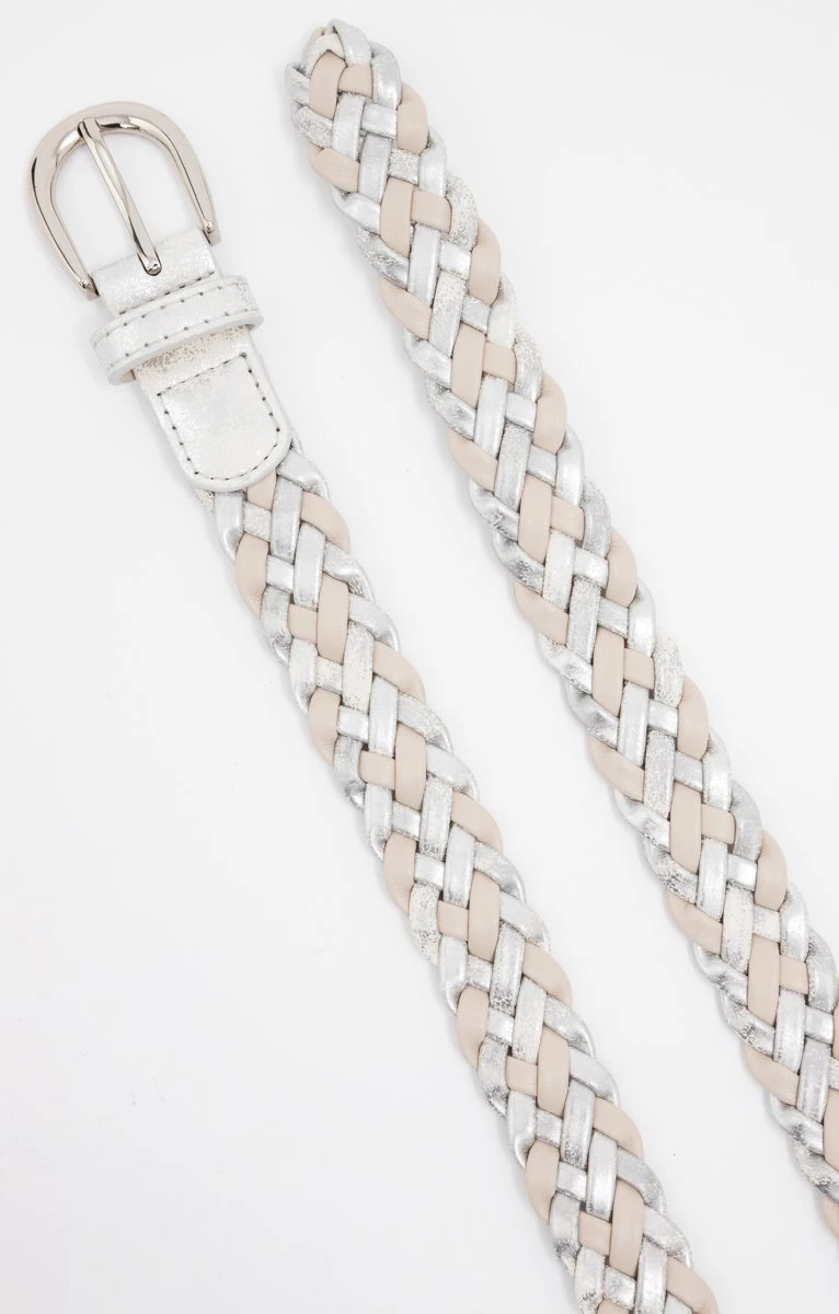Ceinture tressée bicolore. Façon cuir. Tressage mêlant des bandes unies et des bandes métallisées, dans des teintes légèrement contrastantes. Largeur standard, pour être portée avec un pantalon. Fermeture par une boucle à l’extrémité arrondie, en métal argenté. Empiècement et passant façon cuir métallisé. Coutures ton sur ton sur l’empiècement. Extrémité de la ceinture légèrement arrondie.