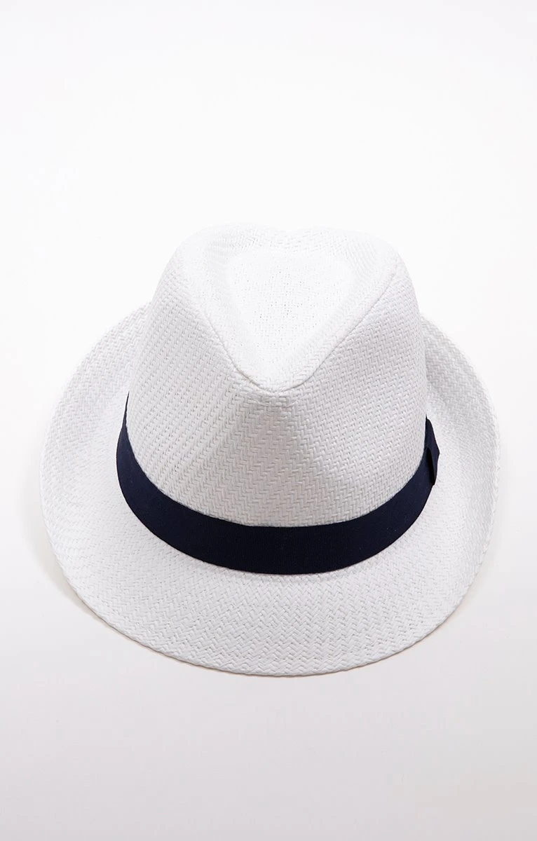Chapeau façon paille forme trilby avec galon contrastant. Forme ronde avec un bord court relevé à l’arrière. Calotte basse et pincée, pointue vers l’avant. Chapeau uni façon paille avec un tissage en chevrons. Galon en gros grain contrastant autour de la calotte, avec un nœud plat sur le côté. Ce chapeau apporte une touche décontractée chic à toutes les tenues.