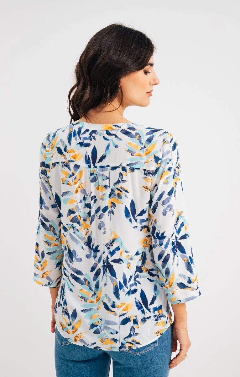 Chemise à motifs feuilles. Coupe droite fluide. Manches 3/4 à emmanchures droites ajustables par une patte boutonnée. Décolleté en V. Fermeture boutonnée devant. Imprimé à motifs feuilles multicolores sur fond uni, sur l’ensemble du modèle. Découpe horizontale et fronces dans le dos. Découpe et fronces aux épaules. Bas liquette. Notre mannequin Laura mesure 1m78 et porte une chemise taille 1.