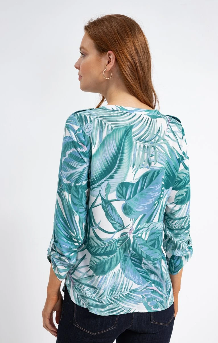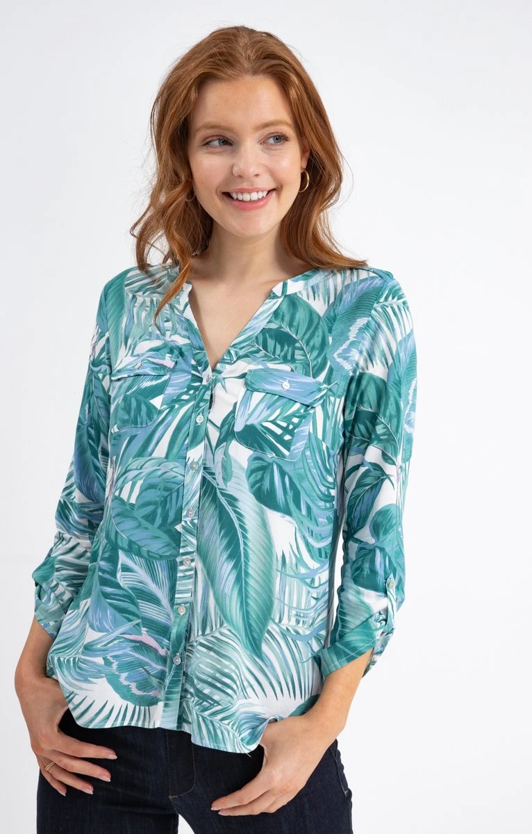 Chemisier fluide à motifs feuilles tropicales. Coupe droite fluide. Manches 3/4 ajustables par une patte boutonnée. Décolleté en V. Fermeture boutonnée devant. 2 poches plaquées à rabat boutonné sur la poitrine. Imprimé à motifs feuilles tropicales sur fond uni, sur l’ensemble du modèle. Fentes latérales à la base. Bas liquette. Notre mannequin Anna mesure 1m80 et porte un chemisier taille 1.