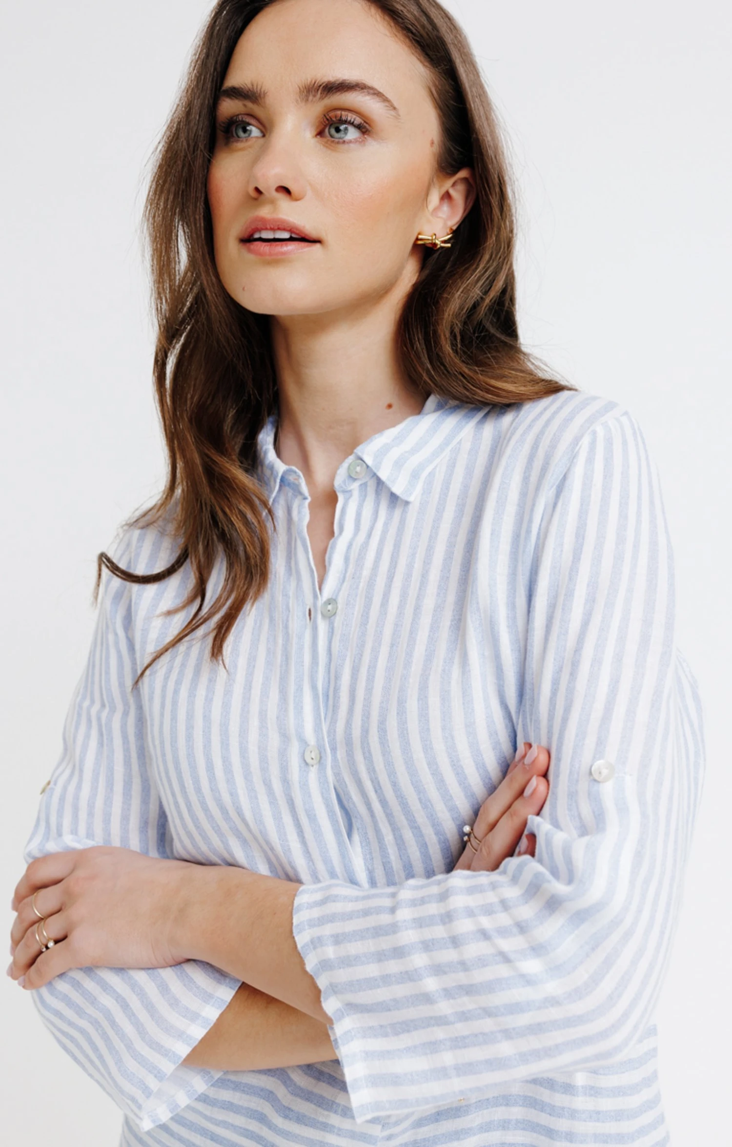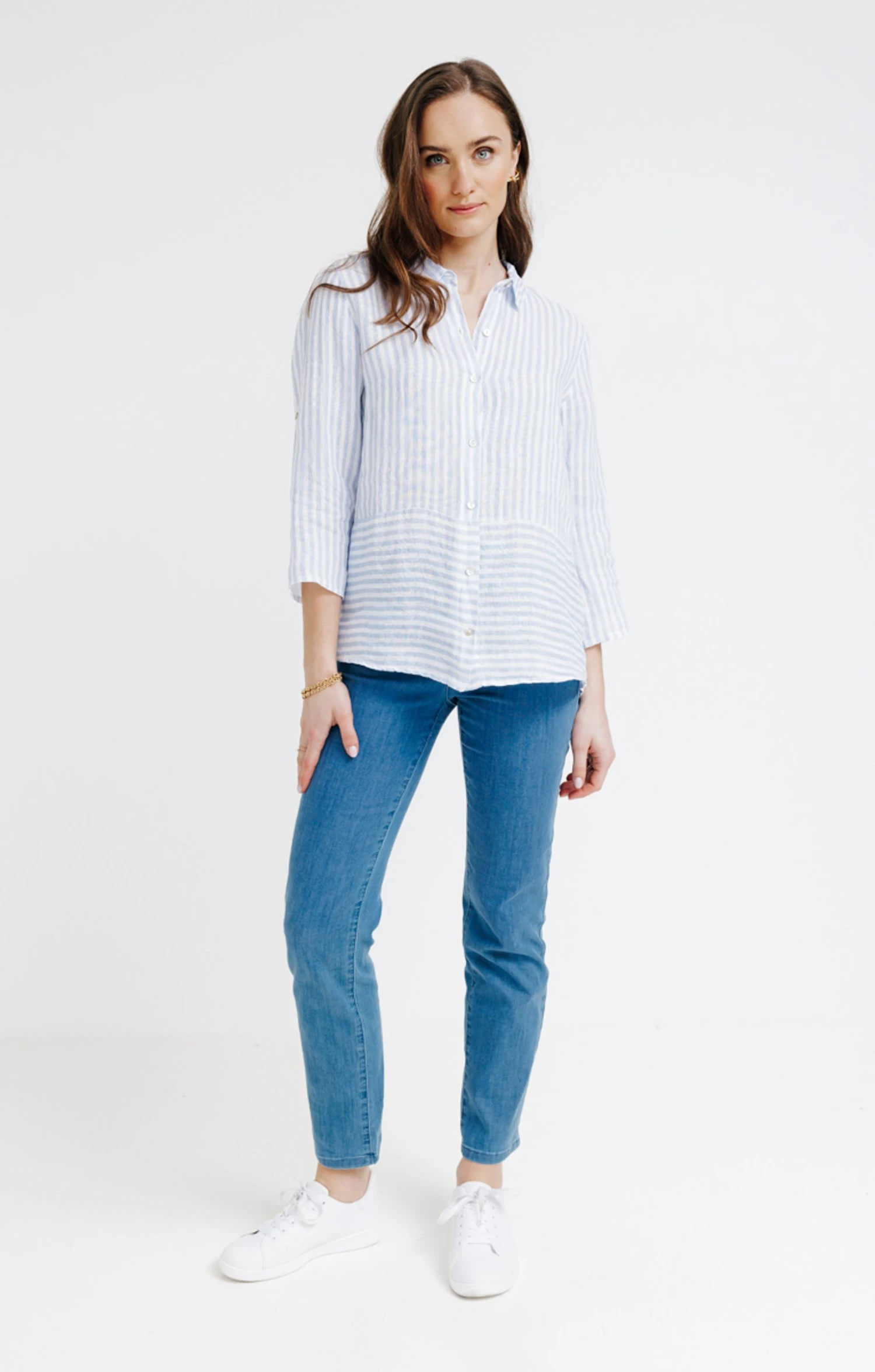 Chemisier en lin rayé avec manches 3/4 et jeu de rayures à l’avant. Coupe ample mi-longue. Manches 3/4 sur emmanchures droites. Col chemise. Ouverture centrale boutonnée, 7 boutons nacrés. Rayures verticales bicolores sur l’ensemble. Tissu fin et respirant. Base rapportée avec rayures horizontales à l’avant. Composition 100 % lin. Notre mannequin Pauline mesure 1m73 et porte un chemisier taille 1.