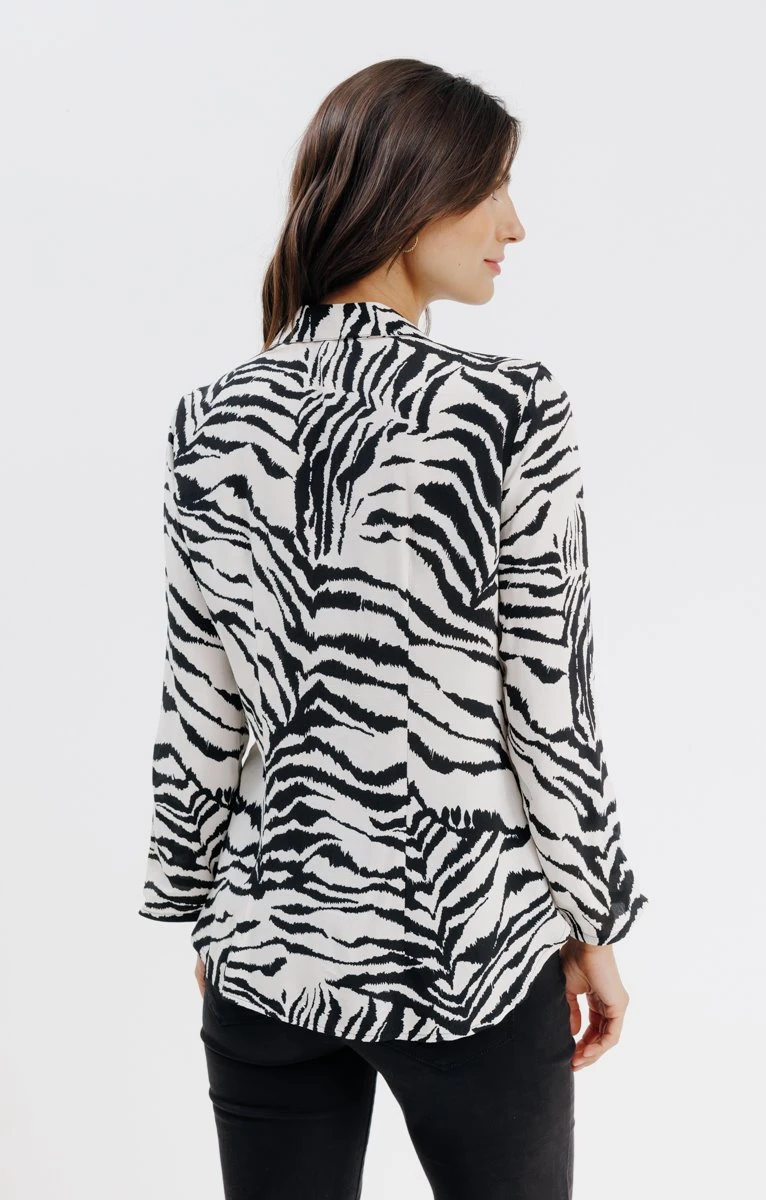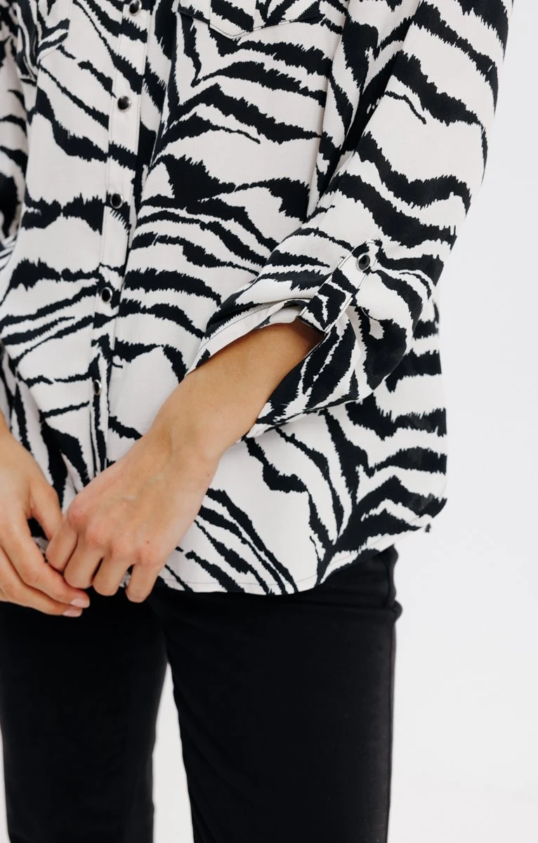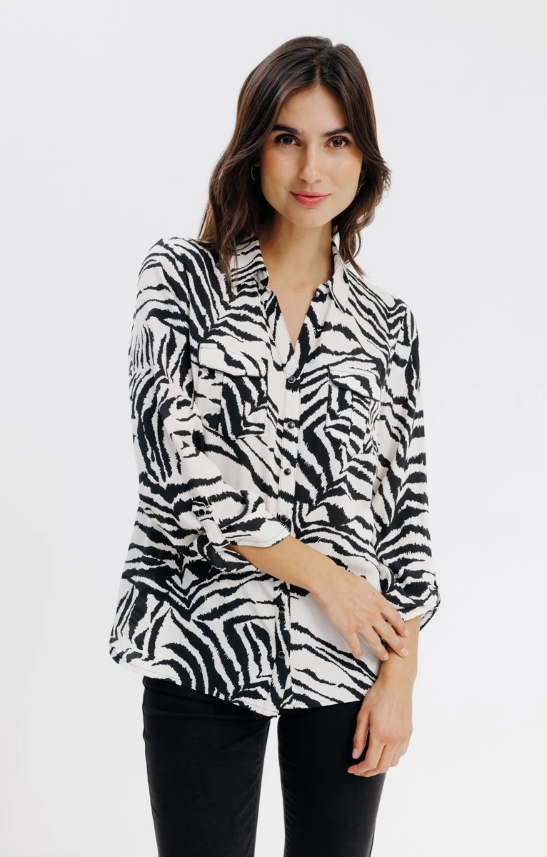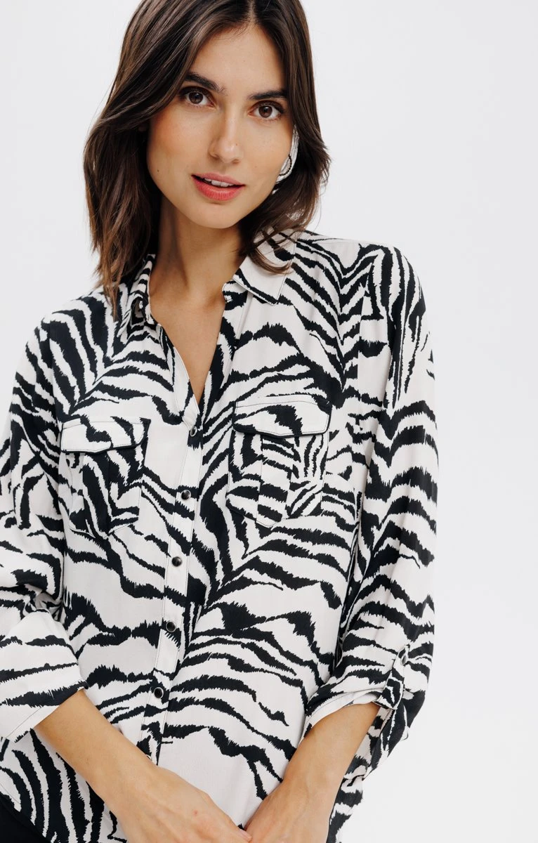 Chemisier fermé par des boutons pression avec imprimé zébré. Coupe légèrement cintrée. Manches longues à remonter au moyen de pattes pressionnées. Col chemise secondé par un décolleté en V. Fermeture à boutons pression cerclés bicolores. 2 poches poitrine plaquées avec pli central et rabat. Motif zébré imprimé. Matière fluide. Base esprit liquette. Notre mannequin Laura mesure 1m78 et porte un chemisier taille 1.
