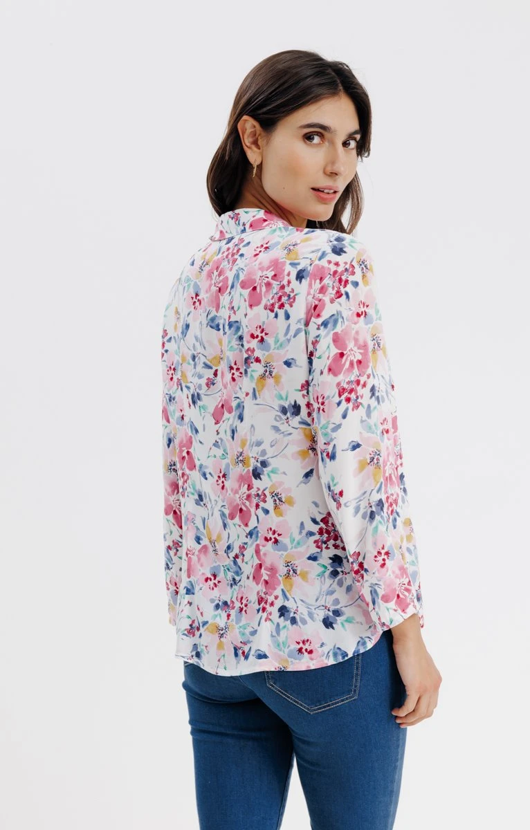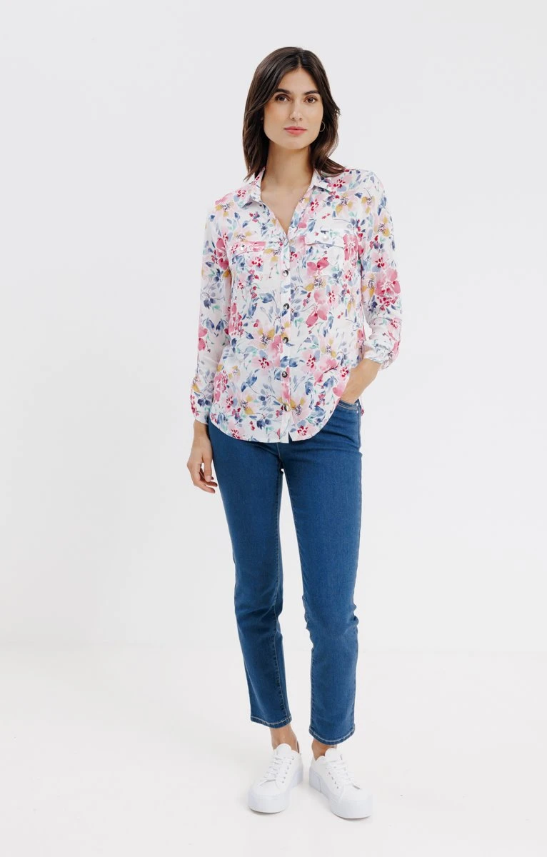 Chemisier imprimé floral à manches 3/4 et col souple. Coupe droite. Manches 3/4 retroussables avec patte de fixation boutonnée. Col chemise. Fermeture boutonnée. 2 poches plaquées à rabat boutonné sur la poitrine. Imprimé floral en all over. Modèle en tissu léger et fluide. Boutons aux finitions argentées. Base légèrement arrondie. Notre mannequin Laura mesure 1m78 et porte un chemisier taille 1.