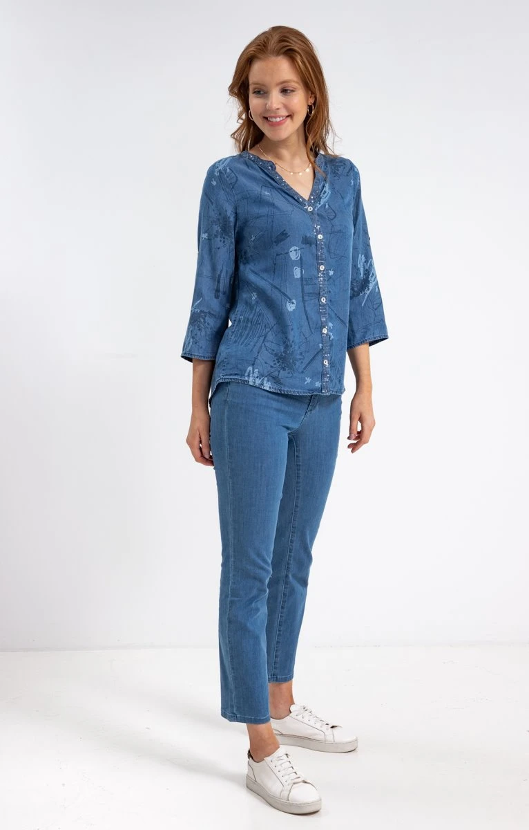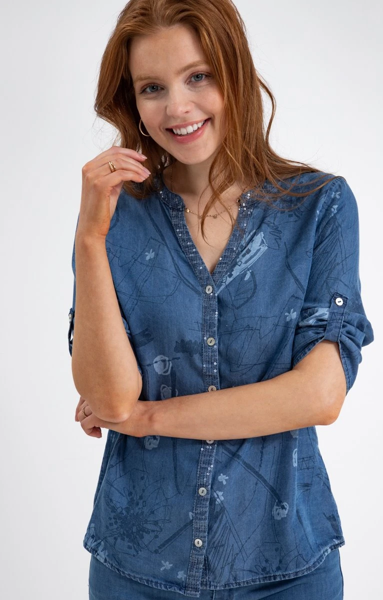 Chemise en chambray à motifs et sequins. Coupe légèrement cintrée. Manches longueur 3/4 qui peuvent être retroussées et maintenues par une patte boutonnée. Col rond avec ouverture en V. Fermeture boutonnée à l’avant. Chemise en chambray imprimé de fleurs et motifs abstraits ton sur ton. Détails de sequins brodés sur la boutonnière et le col. Bas liquette. Composition 100 % lyocell. Notre mannequin Anna mesure 1m80 et porte un chemisier taille 1.