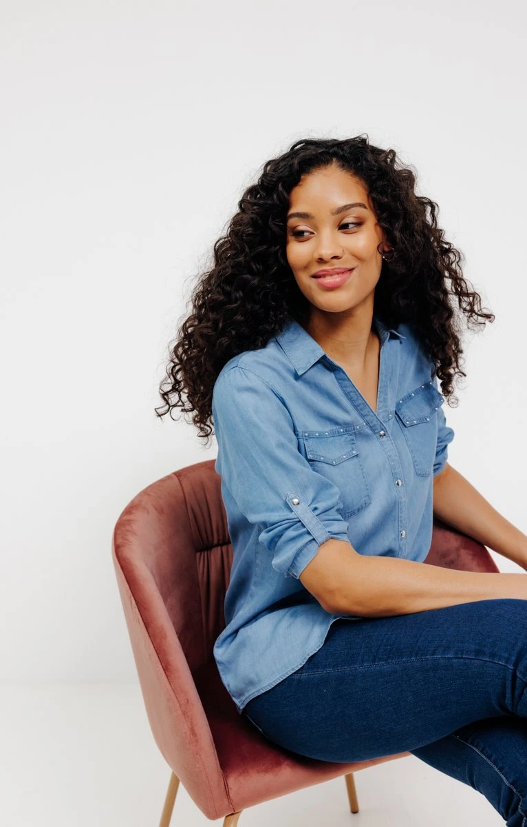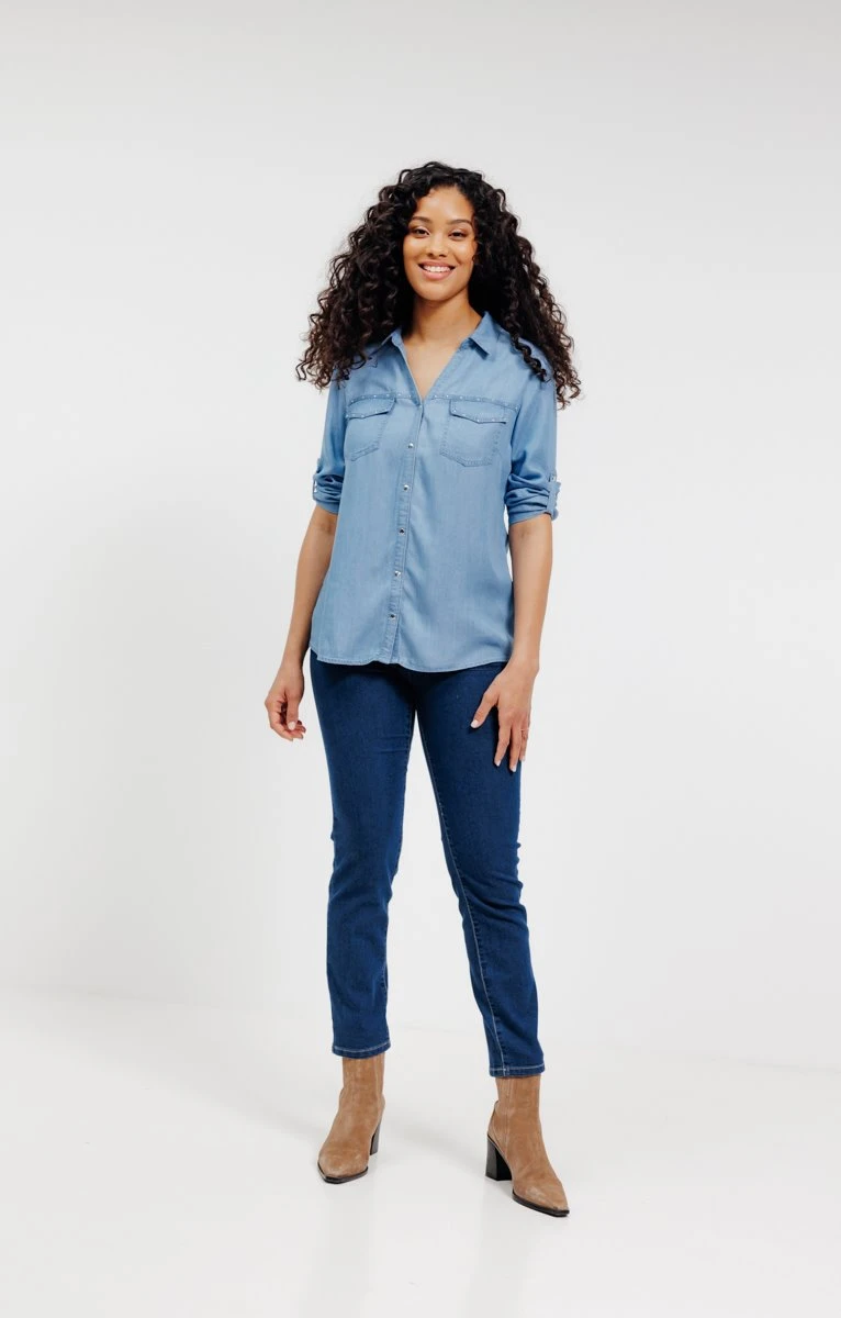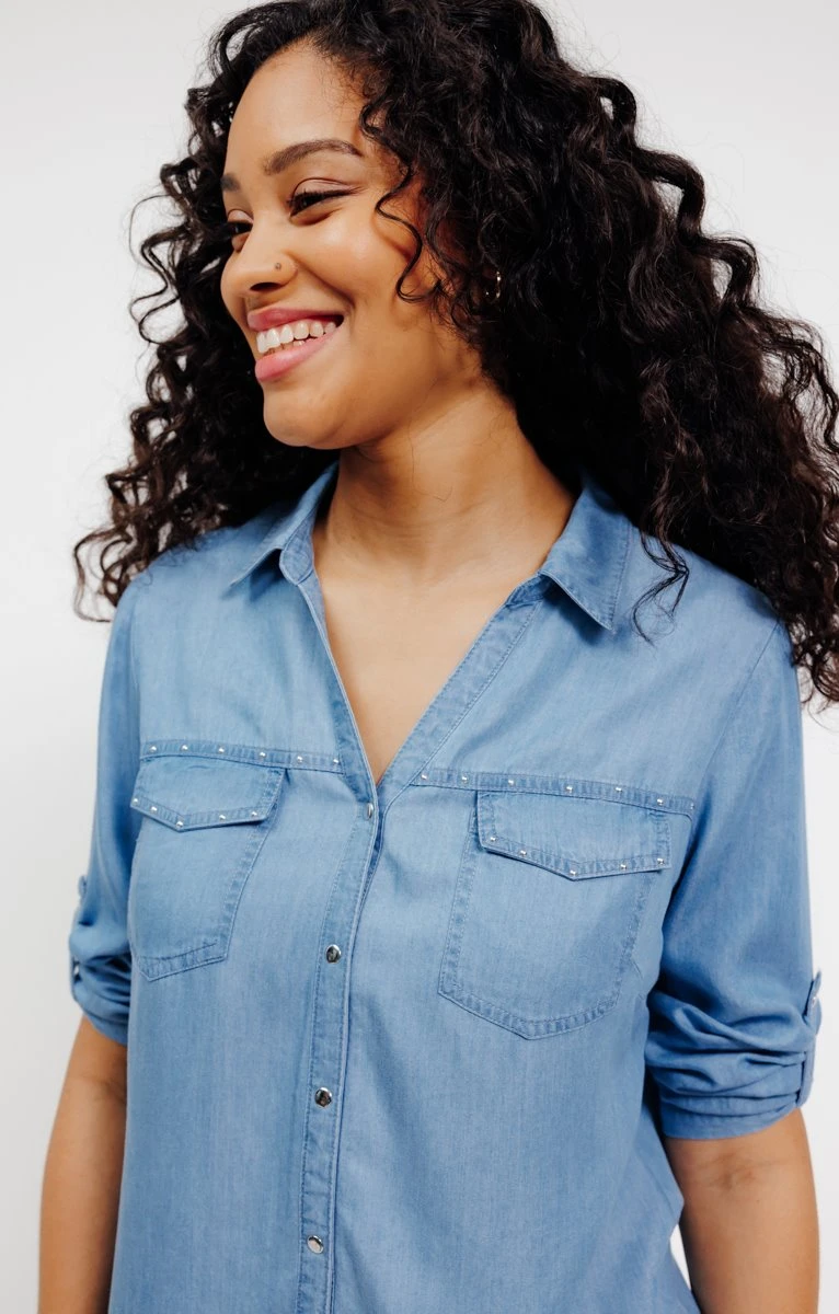 Chemisier en lyocell avec strass. Coupe droite. Manches 3/4 à emmanchures droites avec poignets boutonnés, ajustables par une patte boutonnée. Col chemise classique sur décolleté en V. Fermeture boutonnée devant. 2 poches plaquées à rabat sur la poitrine. Coloris uni. Strass au-dessus des poches et sur le bord du rabat des poches. Composition 100 % lyocell. Notre mannequin Cindy mesure 1m77 et porte un chemisier taille 1.