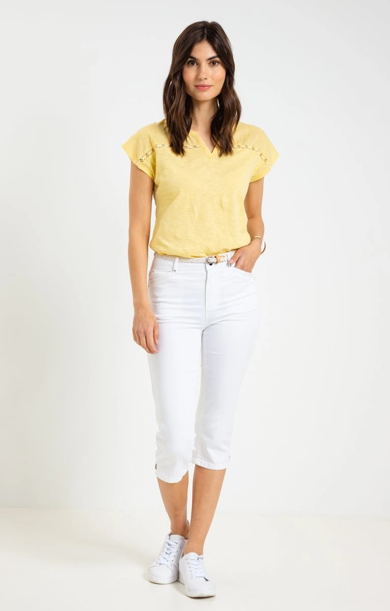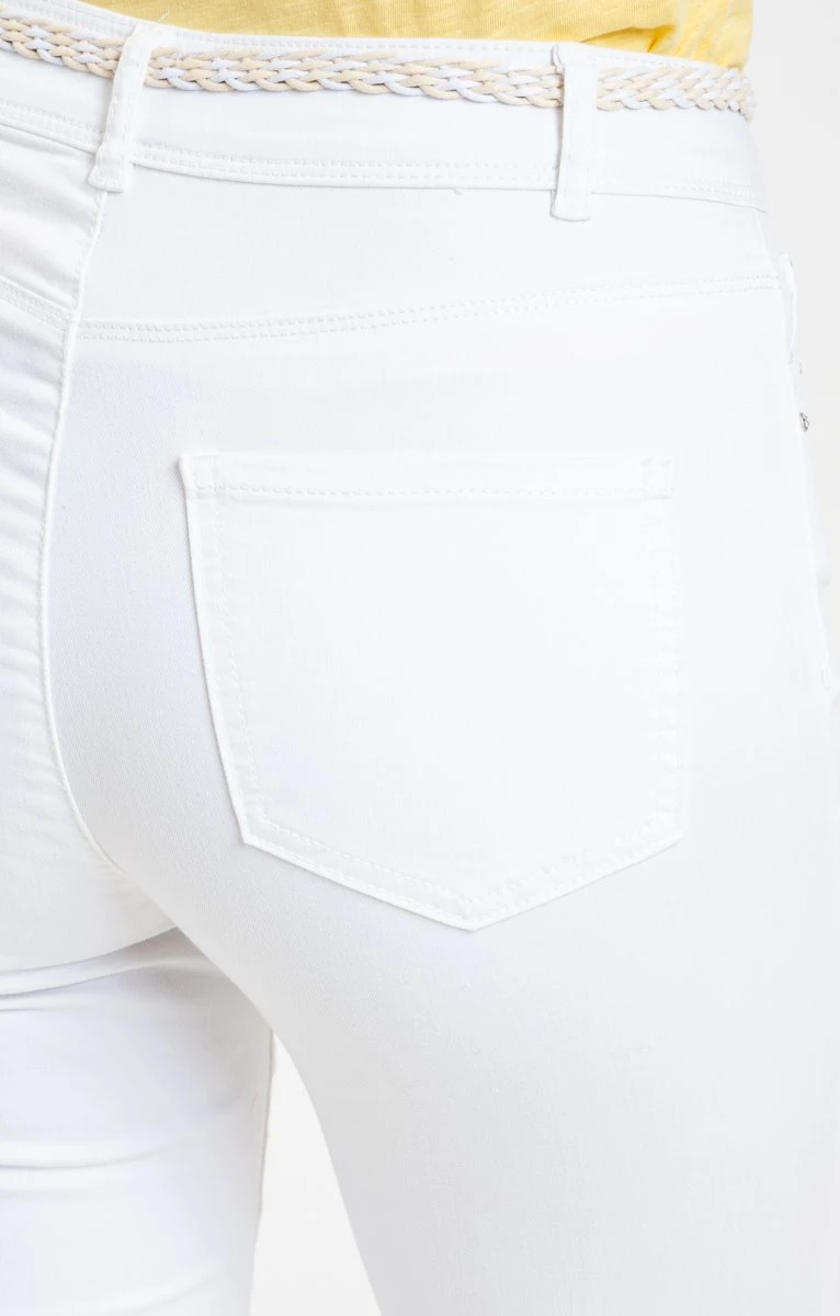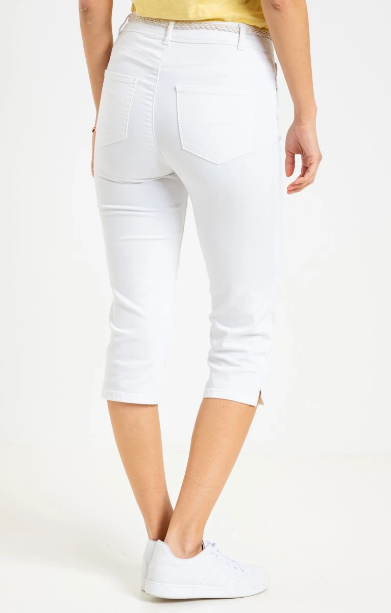 Corsaire avec ceinture tressée. Coupe droite. Longueur juste en dessous du genou. Fermeture zippée et boutonnée devant. 2 poches en biais avec découpe et un ticket devant. 2 poches plaquées au dos. Coloris uni. Matière extensible. Passants pour ceinture. Fine ceinture tressée bicolore fermée par une boucle métallique. Strass au niveau des poches devant. Composition contenant du coton. Notre mannequin Laura mesure 1m78 et porte un corsaire taille 36.