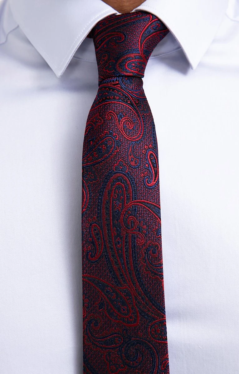 Cravate au motif cachemire rouge et marine. Matière soyeuse. Motifs cachemire tissés en relief. Composition 100 % soie. Cette cravate très colorée apporte une touche fraîche et élégante dans une tenue habillée composée d’un jean ajusté, d’une chemise blanche portée sous une veste de costume et de richelieus en cuir aux pieds.