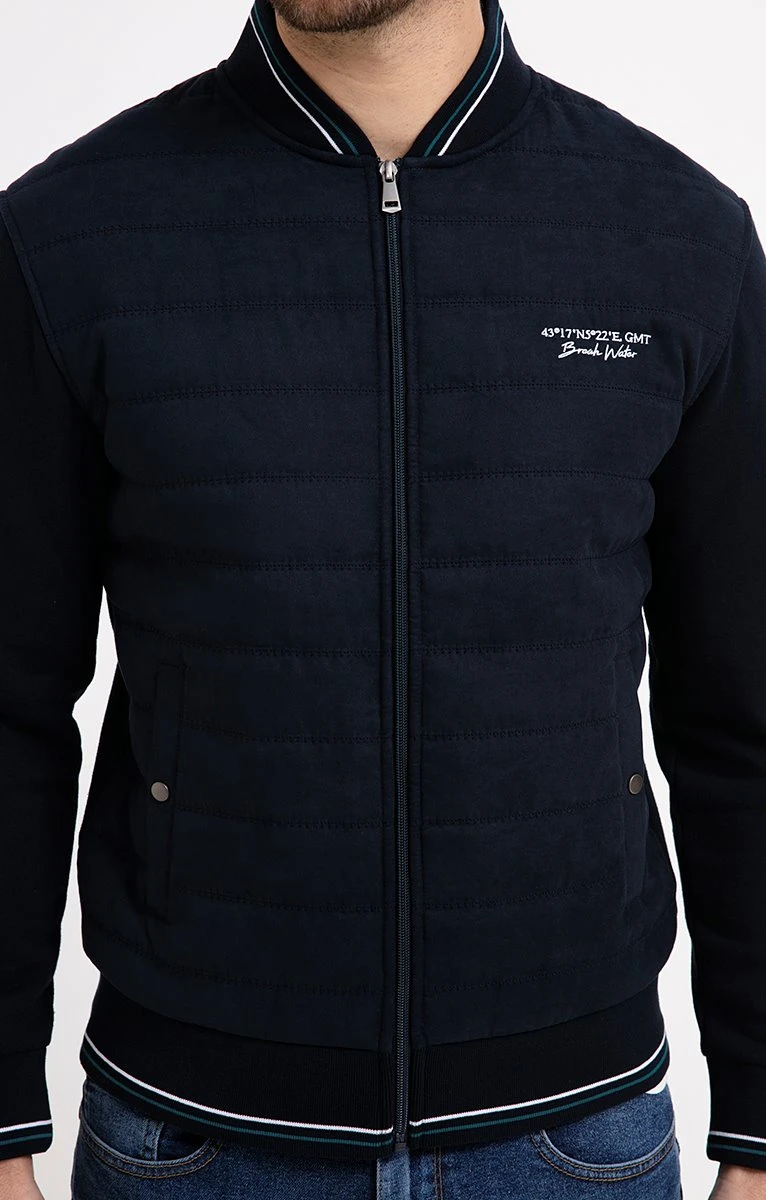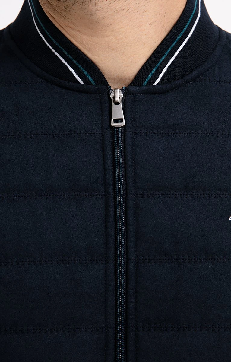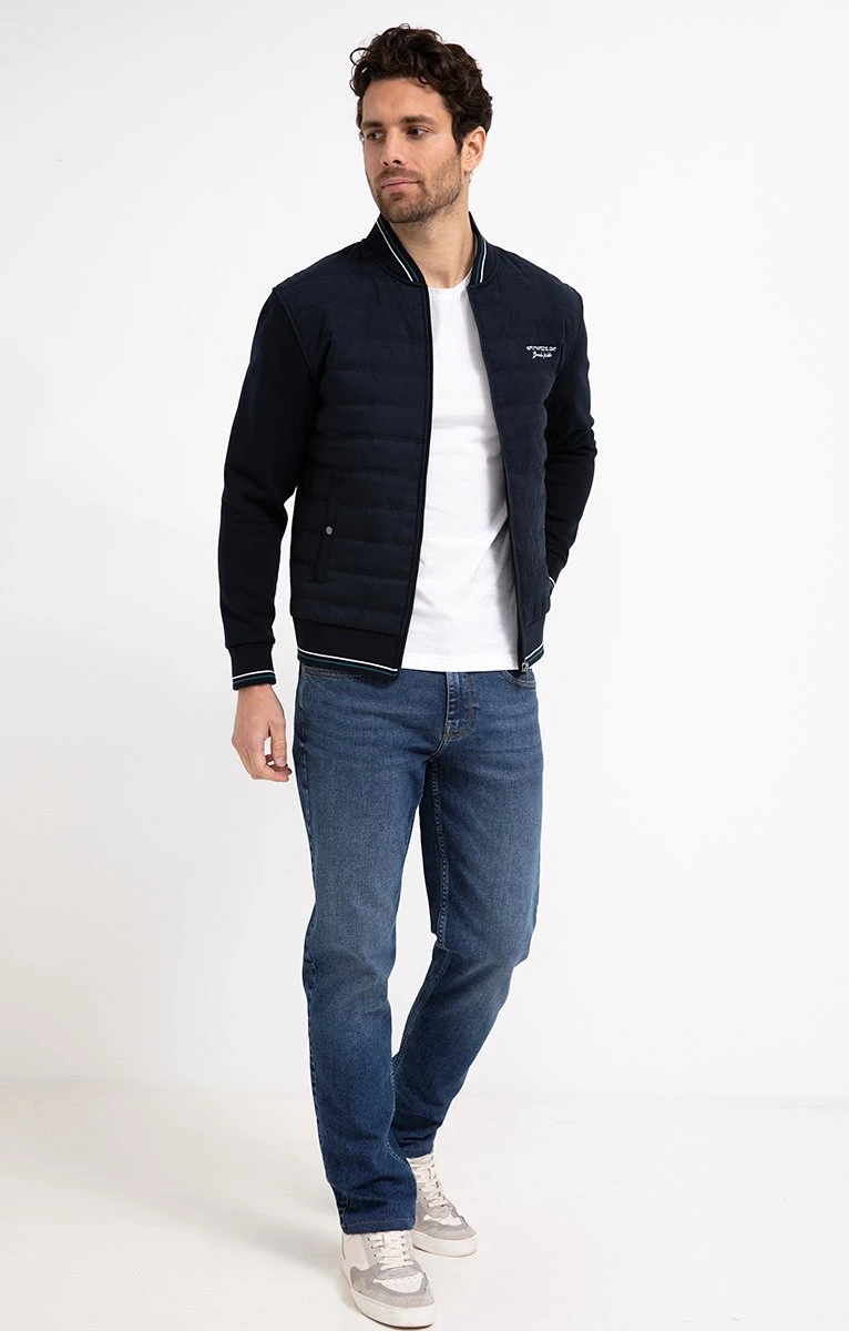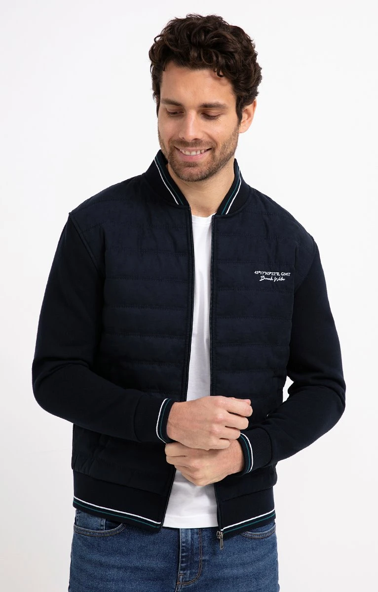 Gilet collège zippé bimatière coton et polyester recyclé. Coupe droite. Manches longues. Col teddy. Fermeture zippée. 2 poches passepoilées pressionnées à hauteur de la taille devant. Coloris uni. Devant et dos effet matelassé suédé. Manches en maille jersey. Col, poignets et base en maille jersey rayée. Message imprimé de teinte contrastée sur la poitrine. Composition en coton majoritaire avec polyester recyclé. Notre mannequin Joffrey mesure 1m88 et porte un gilet taille M.