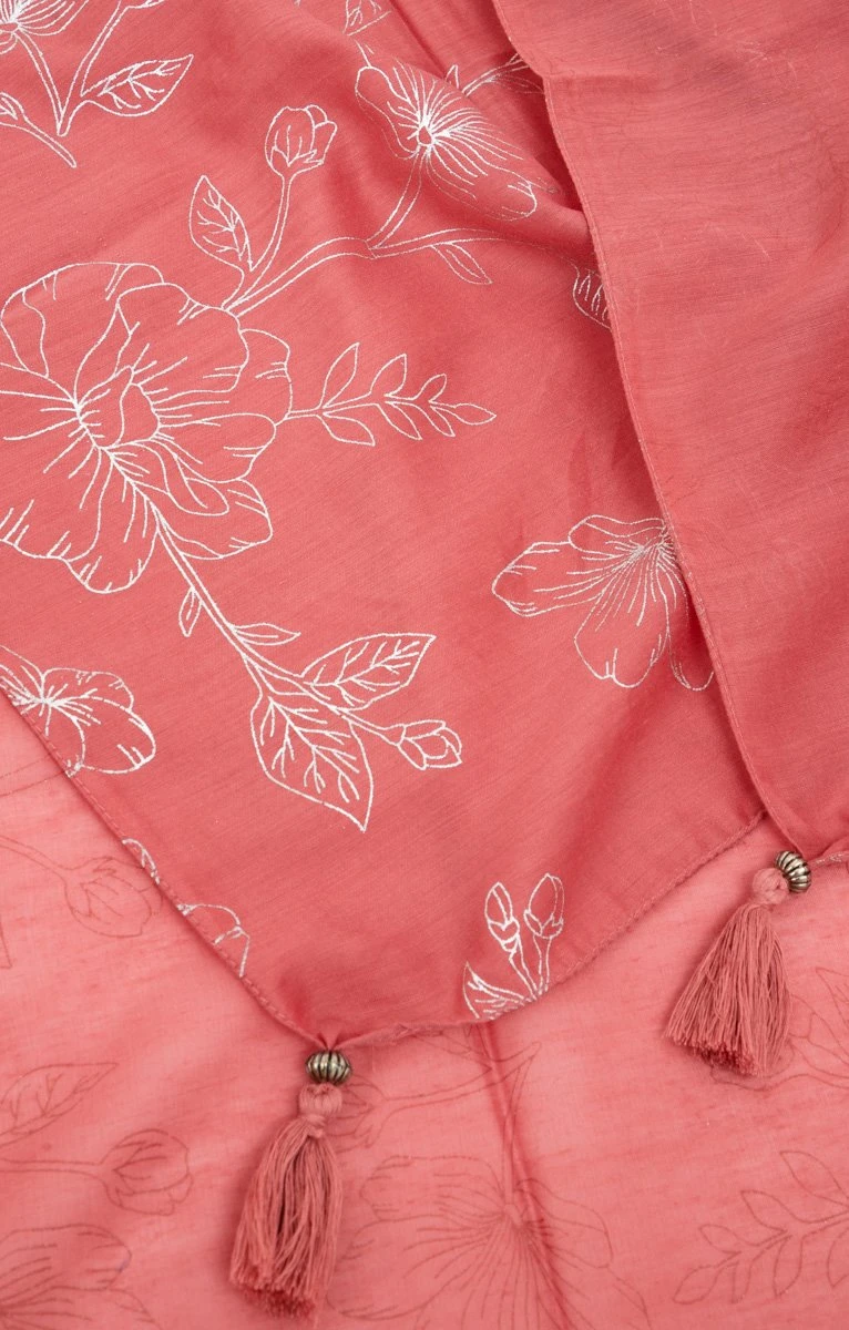 Grand foulard imprimé avec pompons et perles aux coins. Forme rectangulaire et longue, pour un port en écharpe ou en étole. Foulard confectionné en maille fluide et imprimé d’un motif de fleurs en silhouettes sur un fond uni. Détails de pompons en fil uni et perles en métal aux quatre coins du foulard. Finition par des ourlets mouchoirs sur les longueurs et les extrémités. Coutures discrètes ton sur ton.