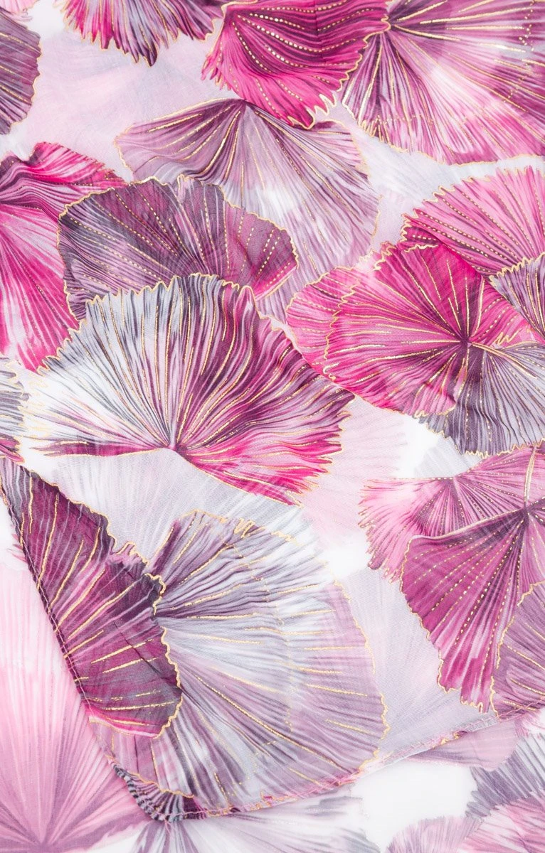 Grand foulard à motifs métallisés. Forme rectangulaire et longue, pour un port en écharpe ou en étole. Foulard confectionné en maille fluide, imprimé d’un motif de grandes feuilles sur un fond uni. Détails de lignes et pointillés métallisés en surimpression sur le motif. Finition par des ourlets mouchoirs sur les longueurs et les extrémités. Coutures discrètes ton sur ton. Dimensions : 70 x 180 cm.