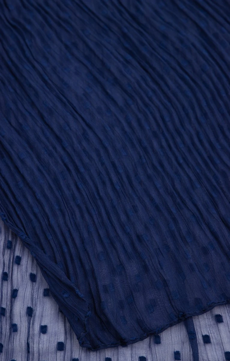 Grand foulard en voile uni plissé à plumetis carrés. Grand format rectangulaire. Voile plissé. Coloris uni à motifs plumetis de forme carrée en ton sur ton. Finition par ourlet sur l’ensemble du contour. On décale l’utilisation de ce foulard léger plissé en accessoirisant les anses d’un sac à main en formant un joli nœud souple pour ajouter de la matière et du volume.