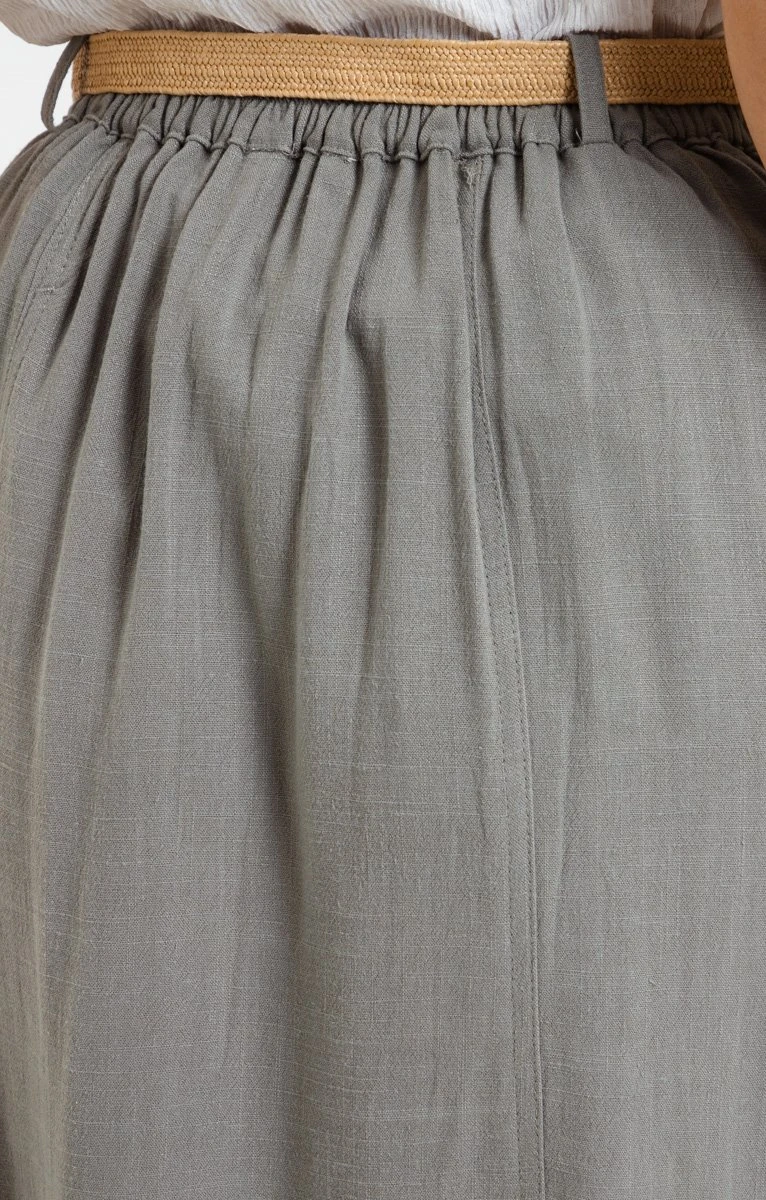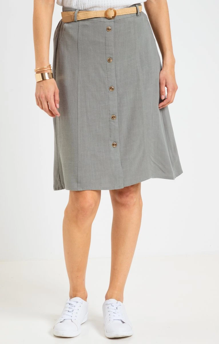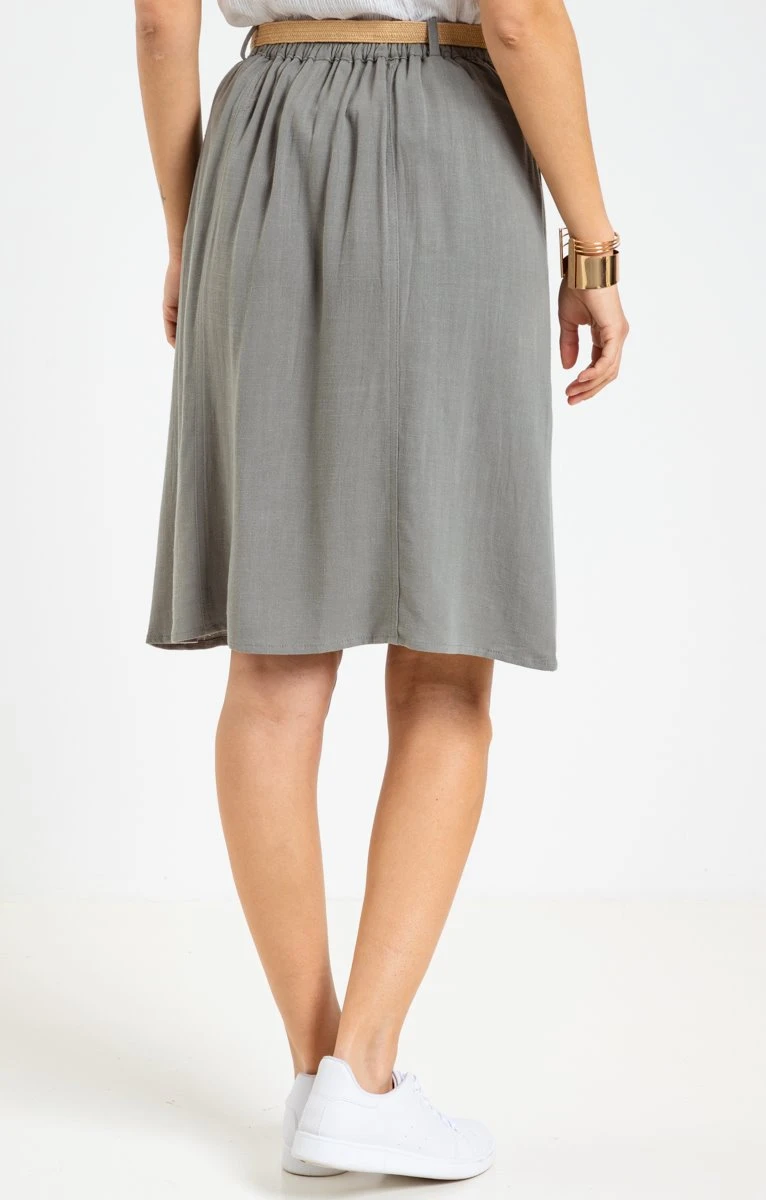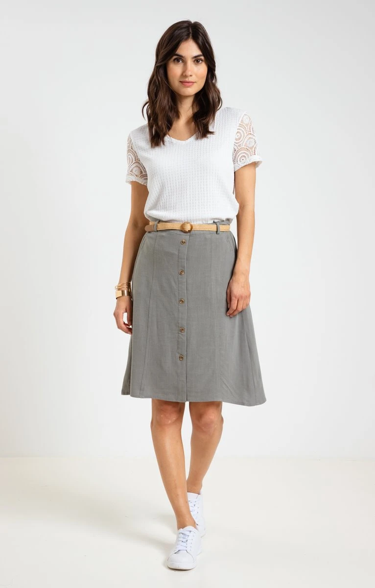 Jupe courte boutonnée avec ceinture. Coupe légèrement évasée. Longueur au-dessus du genou. Fermeture boutonnée sur le devant. Coloris uni. Passants pour ceinture. Fine ceinture texturée contrastante fermée par une boucle ronde. Découpes verticales sur le devant et au dos. Taille élastiquée au dos pour un porté confortable. Coutures discrètes ton sur ton. Notre mannequin Laura mesure 1m78 et porte une jupe taille 36.