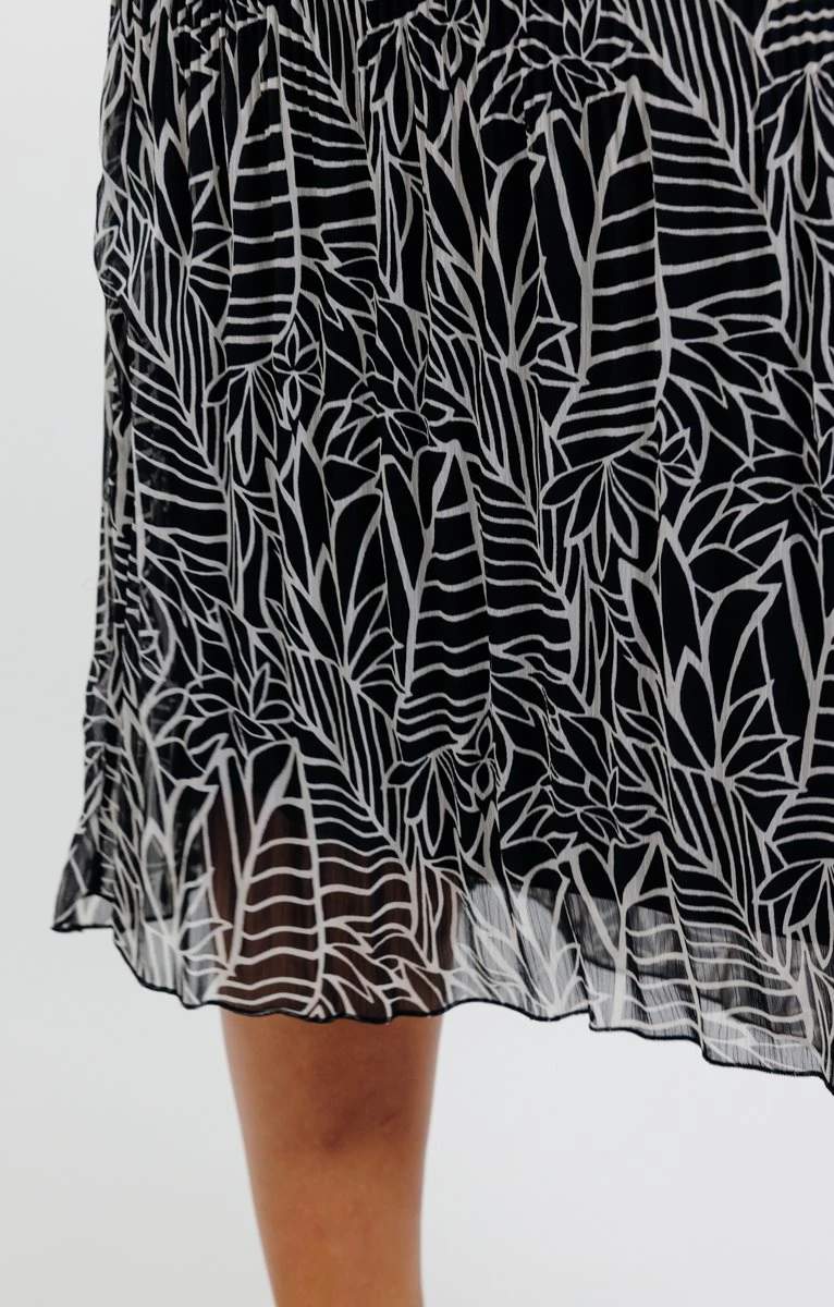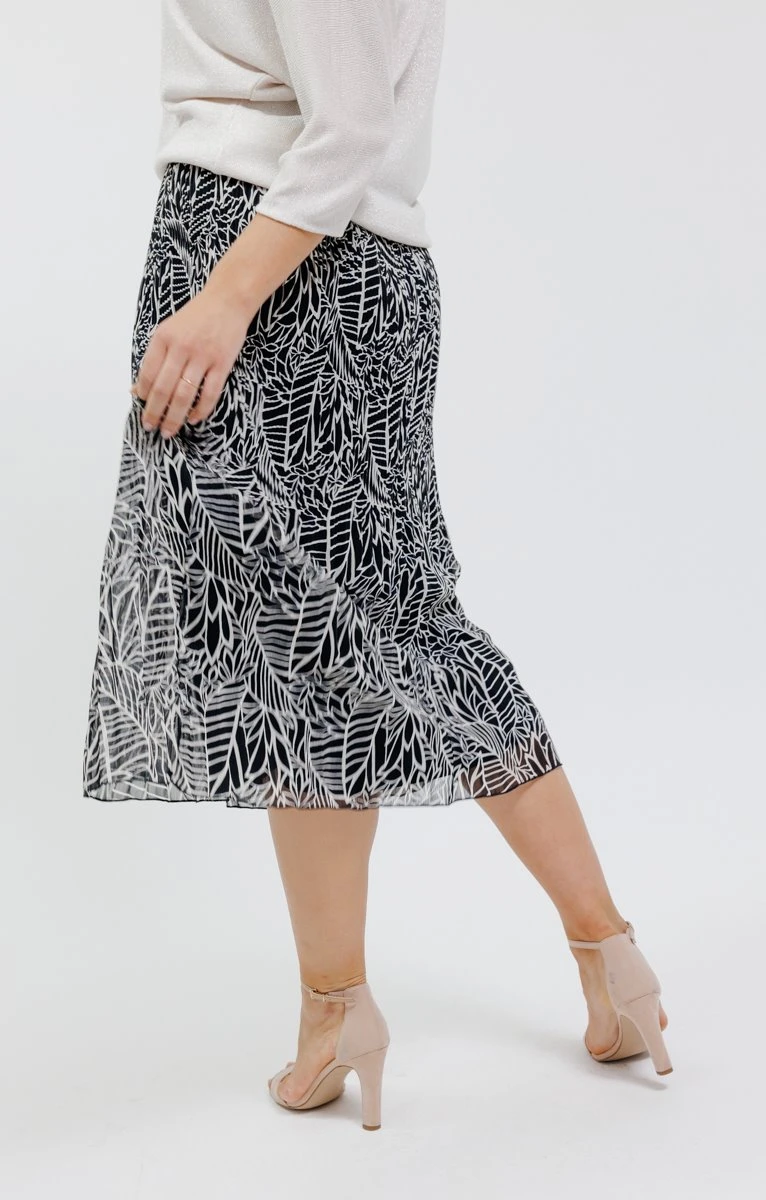 Jupe légère à motifs feuilles. Coupe légèrement évasée. Longueur mi-mollets. Imprimé à motifs grandes feuilles nervurées sur fond uni, sur l’ensemble du modèle. Bicolore. Tissu voile fin et léger, au tombé fluide. Doublure ton sur ton. Taille élastiquée pour un maintien optimal et confortable. Notre mannequin Frédérique mesure 1m78 et porte une jupe taille 36.