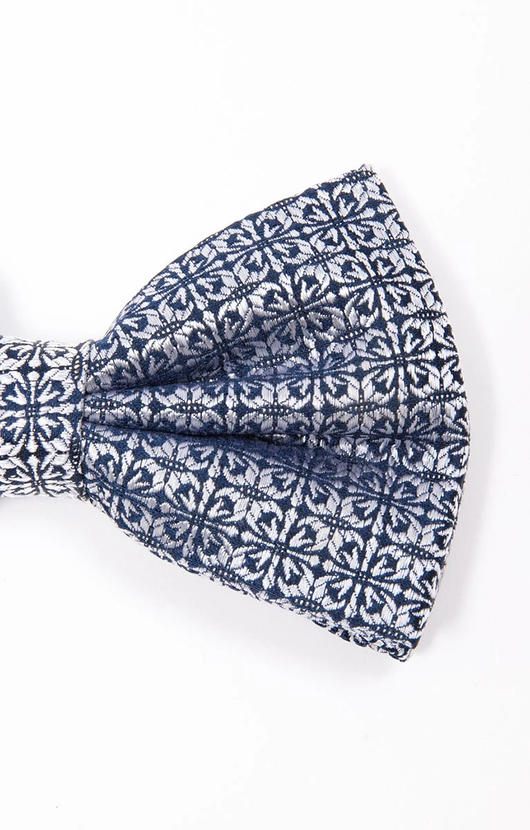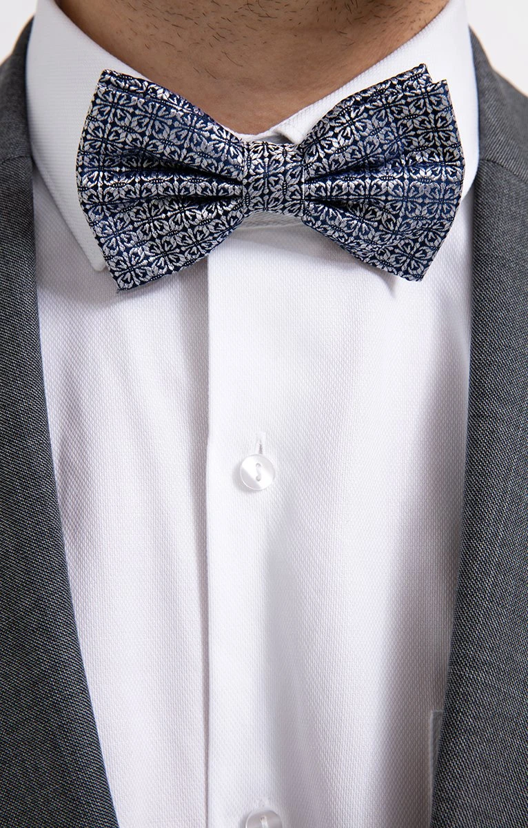 Nœud papillon cérémonie, bicolore avec motifs floraux géométriques. Modèle prénoué à tour de cou réglable. Motifs floraux géométriques sur l’ensemble. Composition 100% soie. Ce nœud papillon en soie bicolore à motifs géométriques se porte volontiers sur une chemise blanche avec un costume gris pour un look formel plein d’élégance.