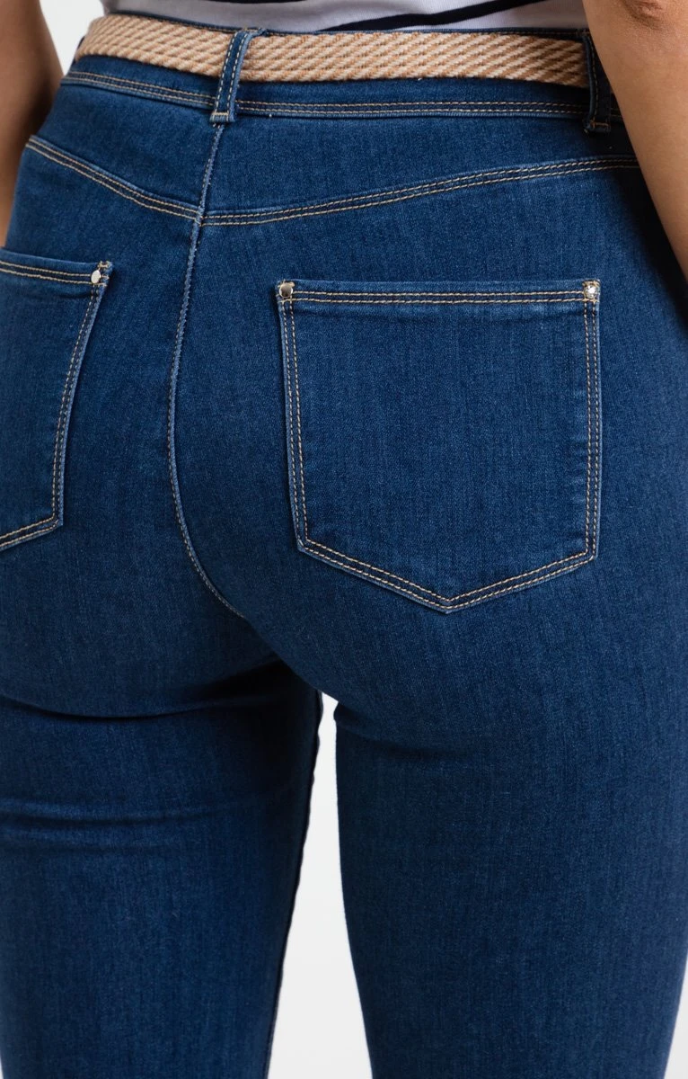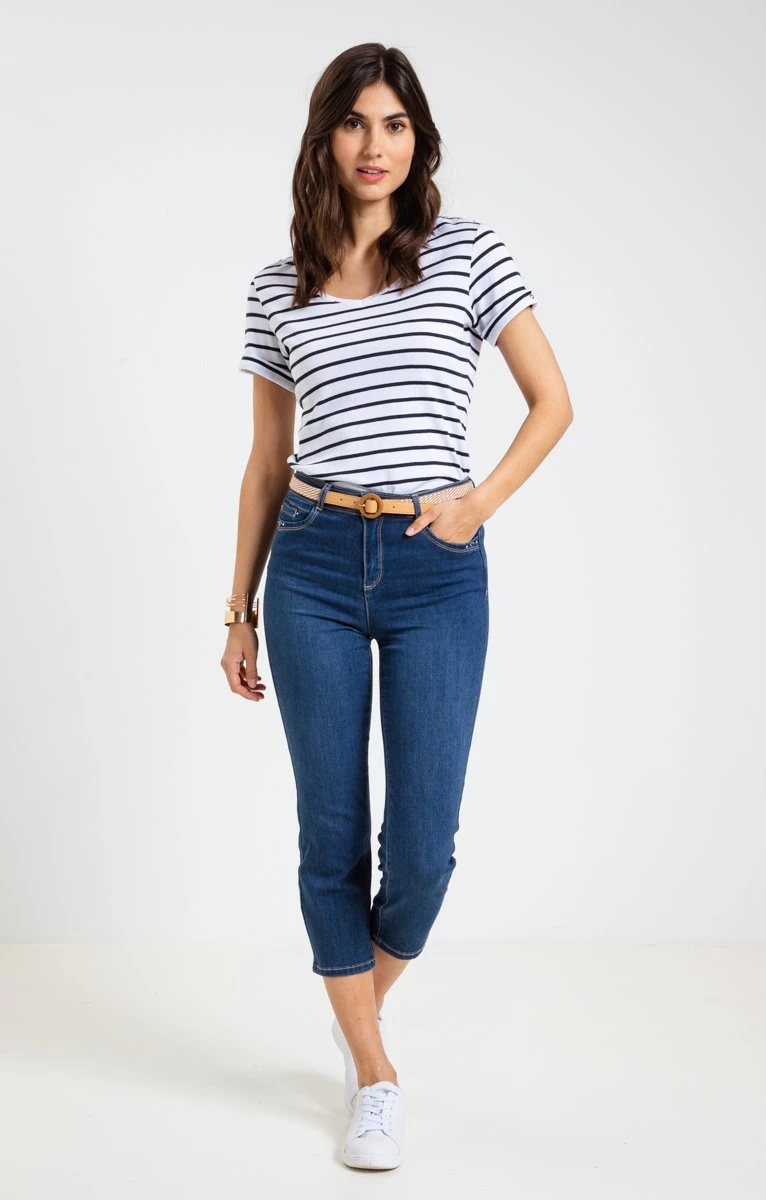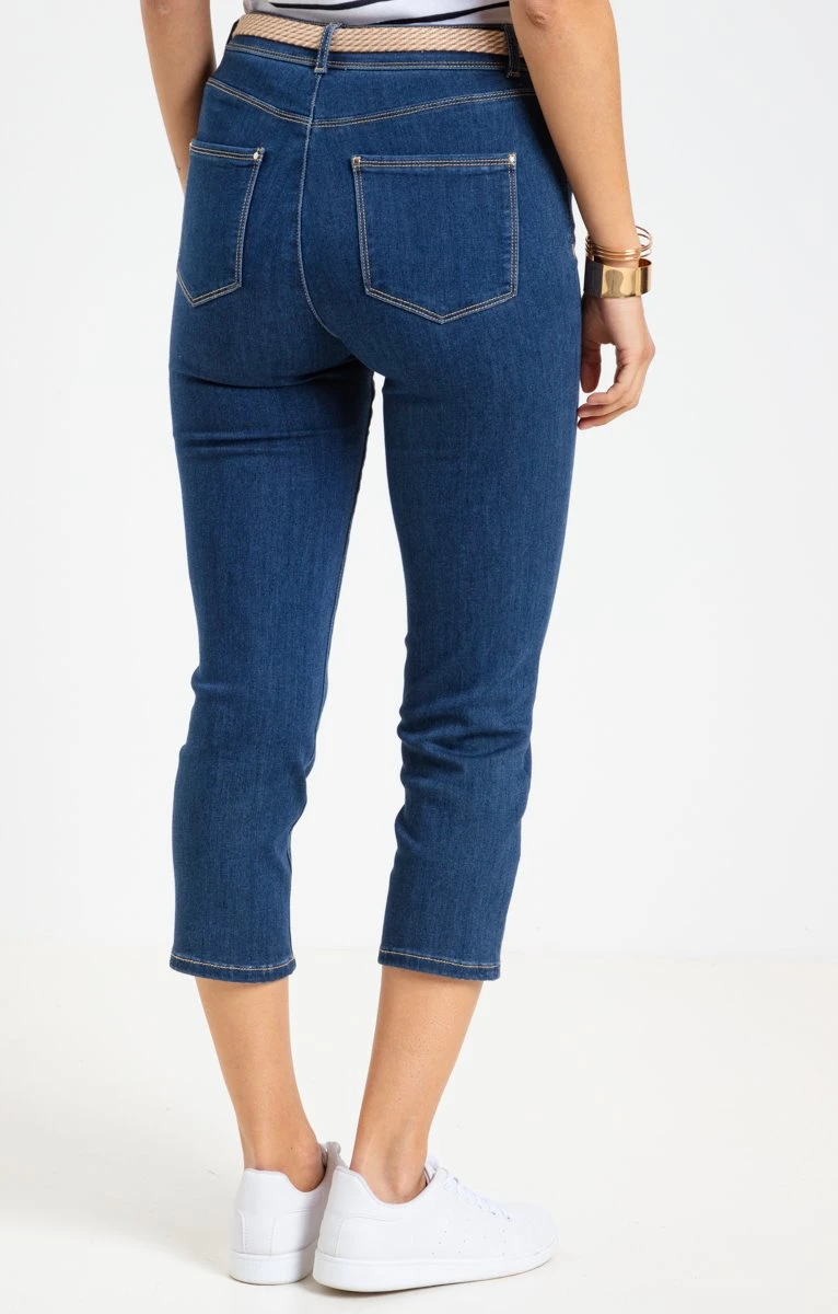 Pantacourt en jean avec ceinture et strass. Coupe droite. Longueur mi-mollet. Fermeture zippée et boutonnée devant. 2 poches cavalières et une fausse poche ticket passepoilée devant. 2 poches plaquées au dos. Coloris uni. Matière extensible. Passants pour ceinture. Strass et studs métalliques sur le bord des poches. Surpiqûres contrastantes. Composition contenant du coton. Notre mannequin Laura mesure 1m78 et porte un pantacourt taille 36.