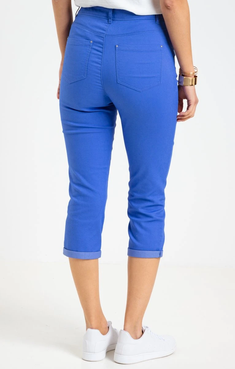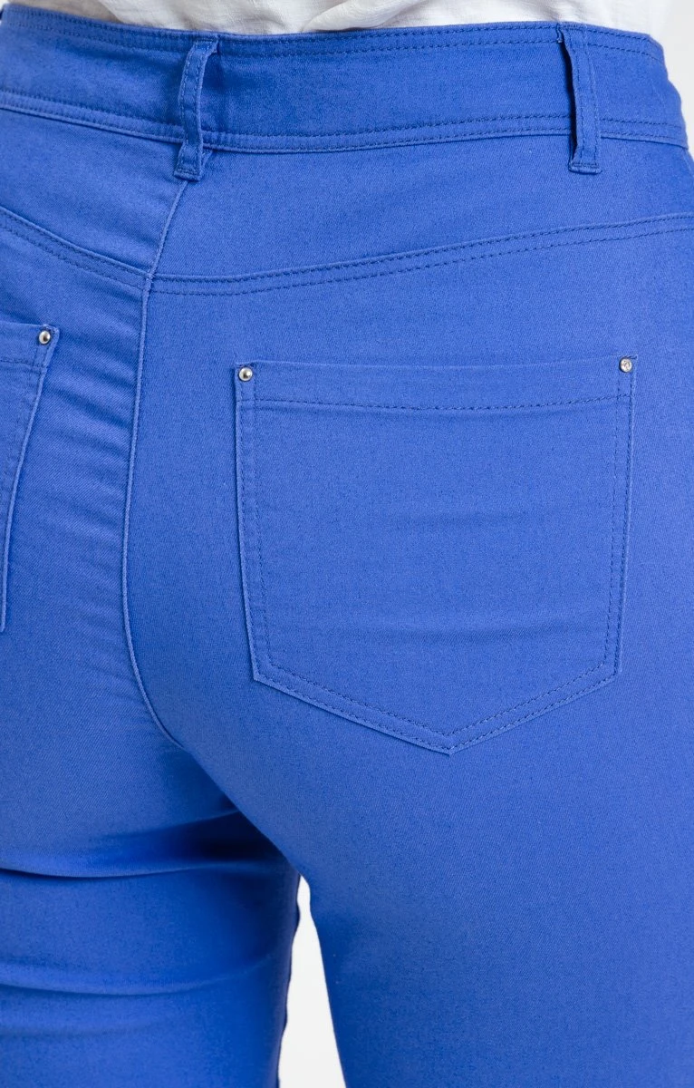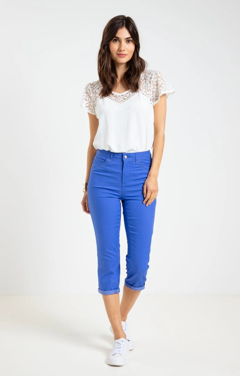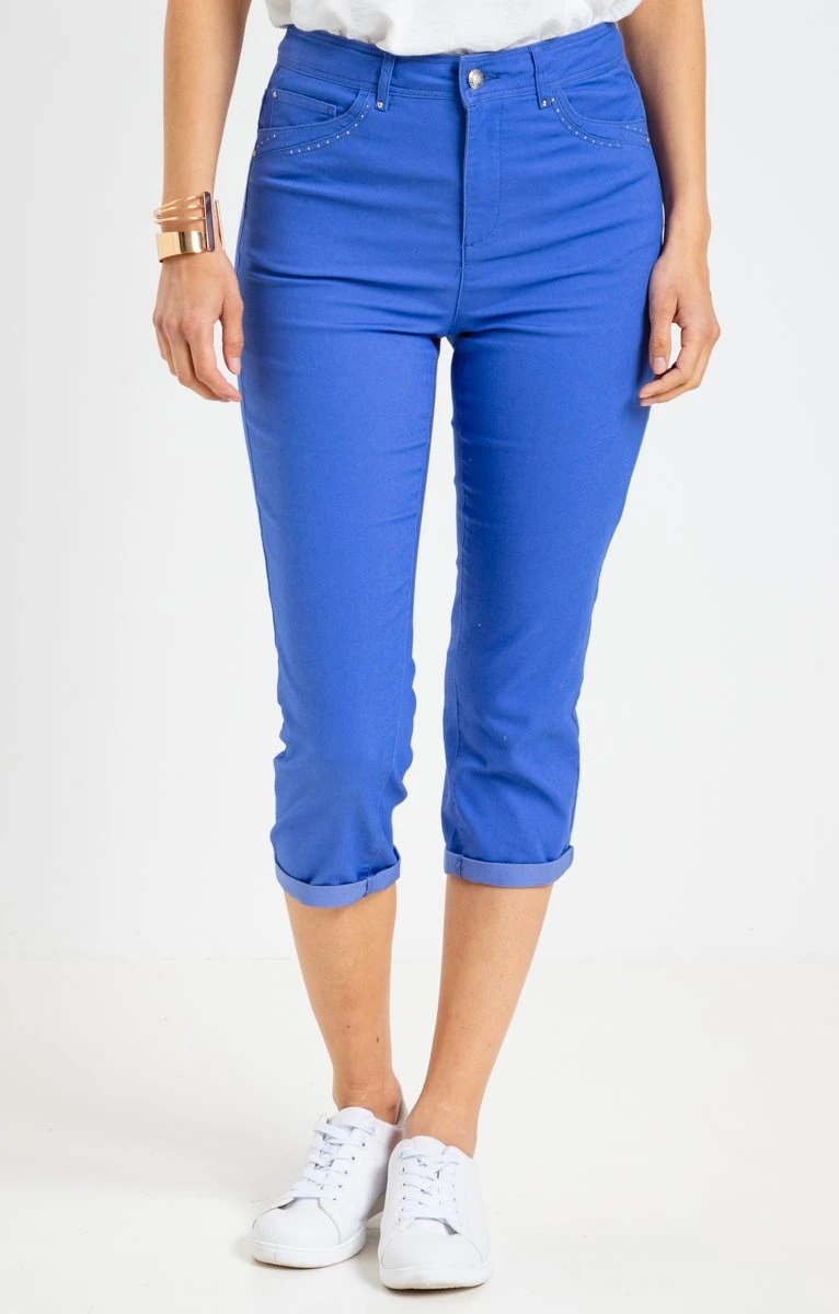 Pantacourt avec strass sur les poches. Coupe ajustée, longueur 7/8. Fermeture zippée et boutonnée. 2 poches italiennes et une poche ticket à l’avant, 2 poches plaquées au dos. Pantacourt uni en twill extensible. Détails de strass sur les poches avant. Rivets en métal sur toutes les poches. Passants pour ceinture. Coutures ton sur ton. Composition en coton mélangé. Notre mannequin Laura mesure 1m78 et porte un pantalon taille 36.