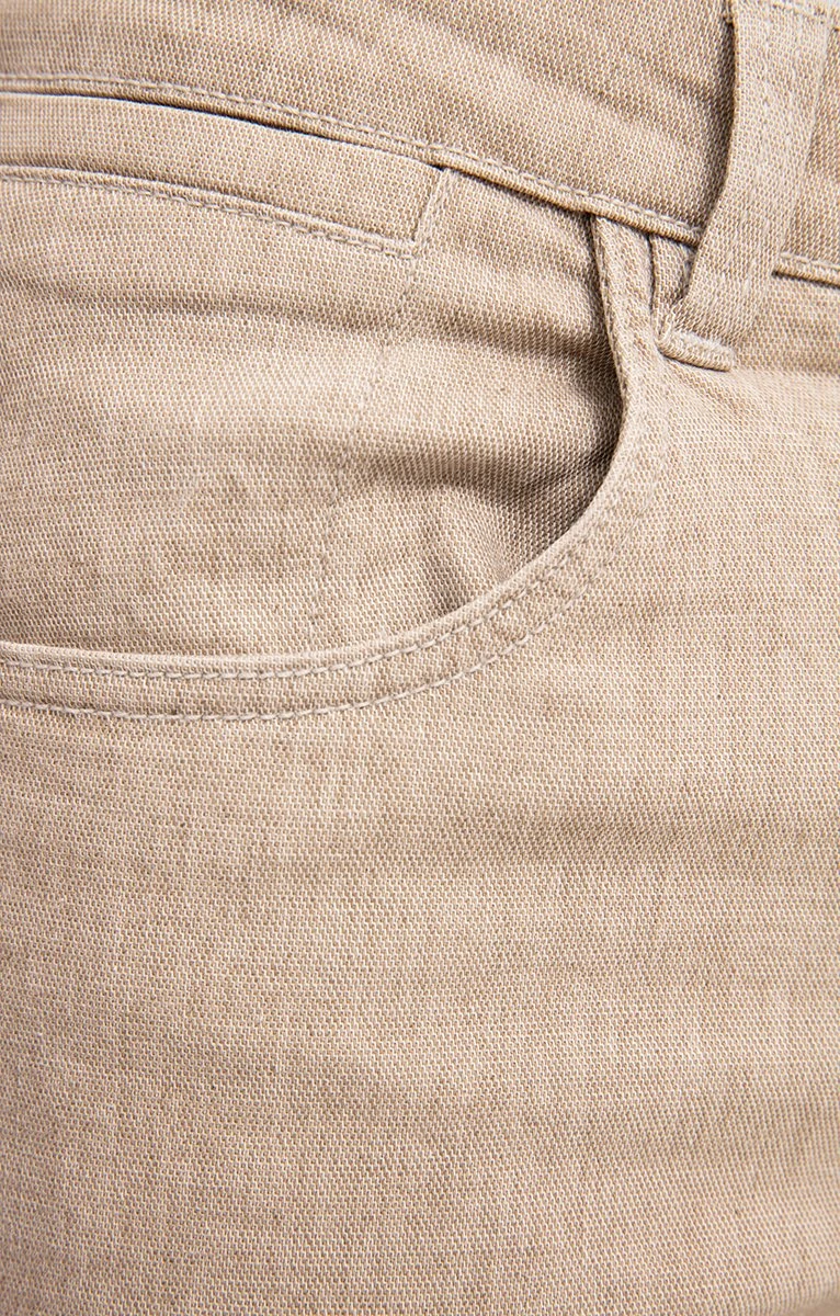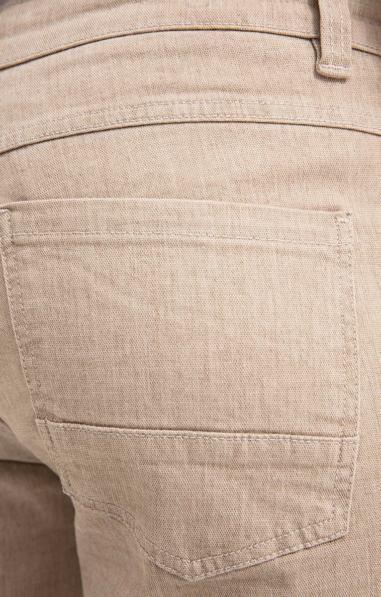 Pantalon 5 poches ajusté en coton majoritaire effet lin uni. Coupe ajustée. Longueur pied. Fermeture par zip recouvert et bouton gravé. 2 poches cavalières et une poche ticket passepoilée devant. 2 poches plaquées légèrement surbaissées au dos. Tissu 3D à micro-alvéoles. 5 passants pour ceinture. Revers roulottés au bas. Composition en coton majoritaire. Notre mannequin Joffrey mesure 1m88 et porte un pantalon taille 42.