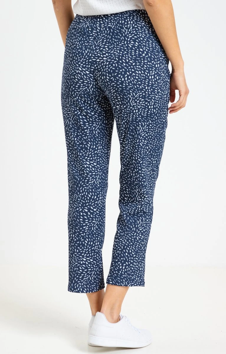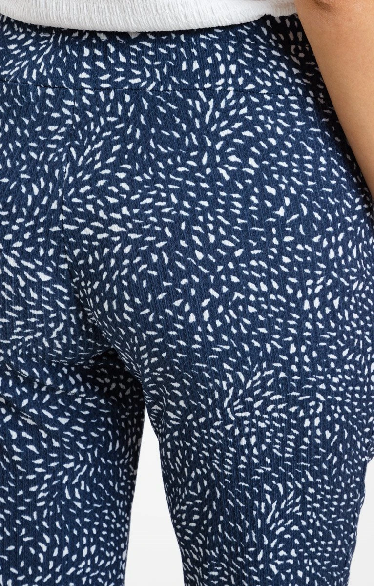 Pantalon jogger à poches imprimé éclats mosaïque une couleur. Coupe effilée. Longueur 7/8. Taille haute à large ceinture plate élastiquée. Modèle à enfiler. 2 poches italiennes devant. Imprimé bicolore, motifs éclats de mosaïque sur l’ensemble. Tissu crêpe texturé. Lien sous coulisse avec œillets métalliques à la taille. Notre mannequin Laura mesure 1m78 et porte un pantalon taille 36.