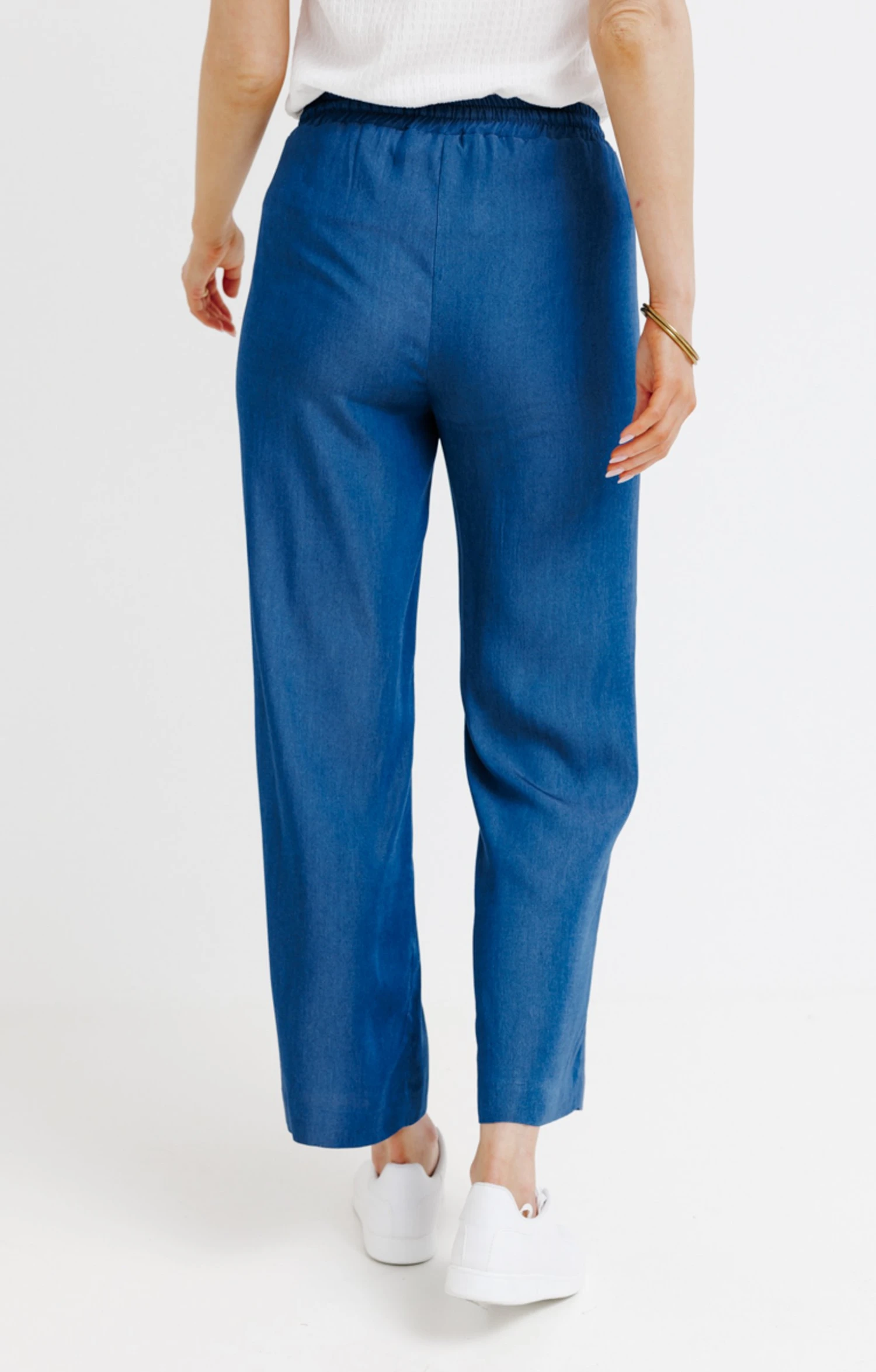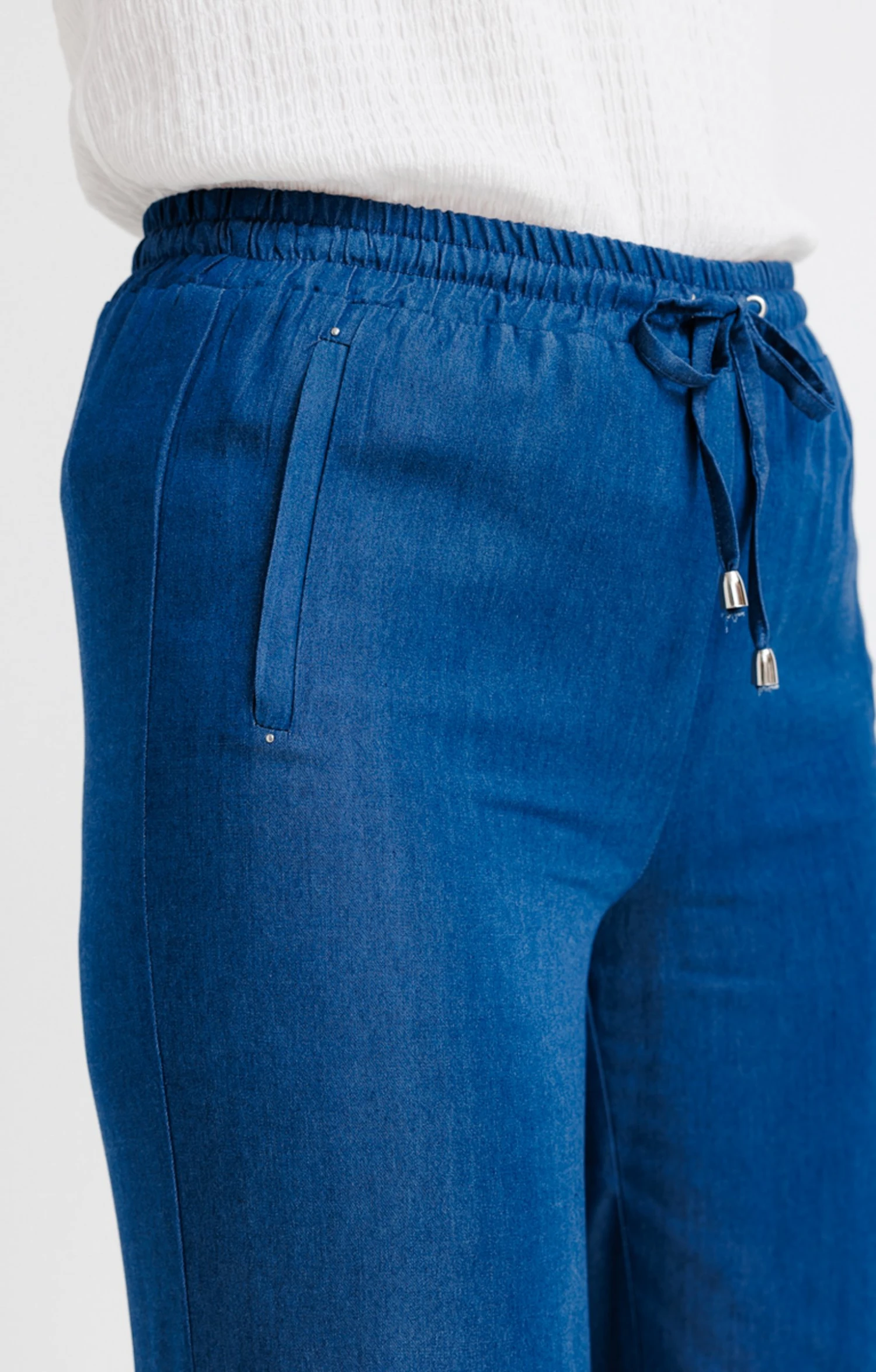 Pantalon large à taille élastiquée. Coupe droite avec jambes larges. Longueur juste au-dessus des chevilles. 2 poches passepoilées verticales sur les côtés. Coloris uni. Matière fine au tombé fluide. Taille élastiquée ajustable par un lien sous coulisse à nouer. Lien terminé par un embout métallique à chaque extrémité. Studs métalliques aux extrémités des poches. Coutures discrètes ton sur ton en finition. Notre mannequin Anna mesure 1m80 et porte un pantalon taille 36.