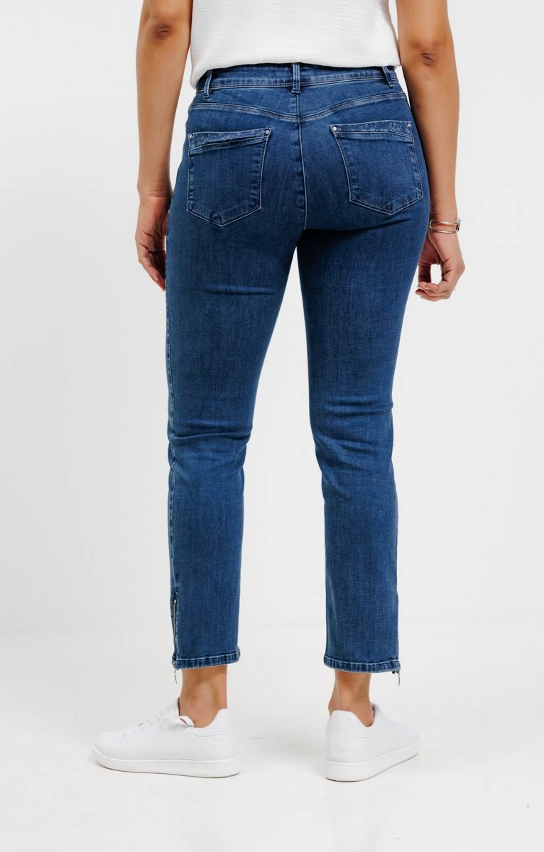 Jean longueur 7/8 avec imprimé fleurs sur les poches arrière et bas zippé. Hanches ajustées et bas droit. Longueur 7/8. Fermeture zippée et boutonnée. 2 poches arrondies à l’avant. 2 poches plaquées au dos. Jean en denim stretch avec un délavage léger. Empiècement avec imprimé floral ton sur ton sur le haut des poches arrière. Bas zippé. Passants pour ceinture. Rivets en métal. Composition en coton majoritaire. Matière très qualitative et galbante qui apporte une sensation « une taille en moins ». Notre mannequin Cindy mesure 1m77 et porte un pantalon taille 36.