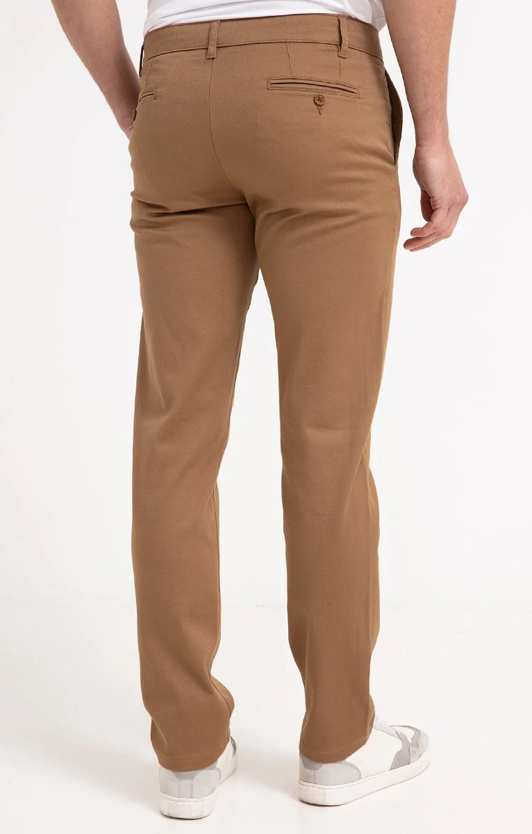 Pantalon chino slack uni coupe droite. Coupe droite regular. Longueur pied. Fermeture par zip recouvert et bouton gravé ton sur ton. 2 poches italiennes et une poche ticket passepoilée devant. 2 poches passepoilées boutonnées au dos. Tissu uni façonné. 5 passants pour ceinture. Composition en coton majoritaire. Notre mannequin Joffrey mesure 1m88 et porte un pantalon taille 42.