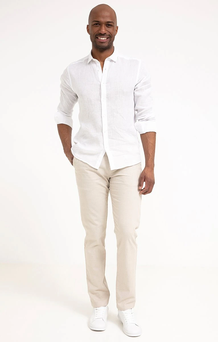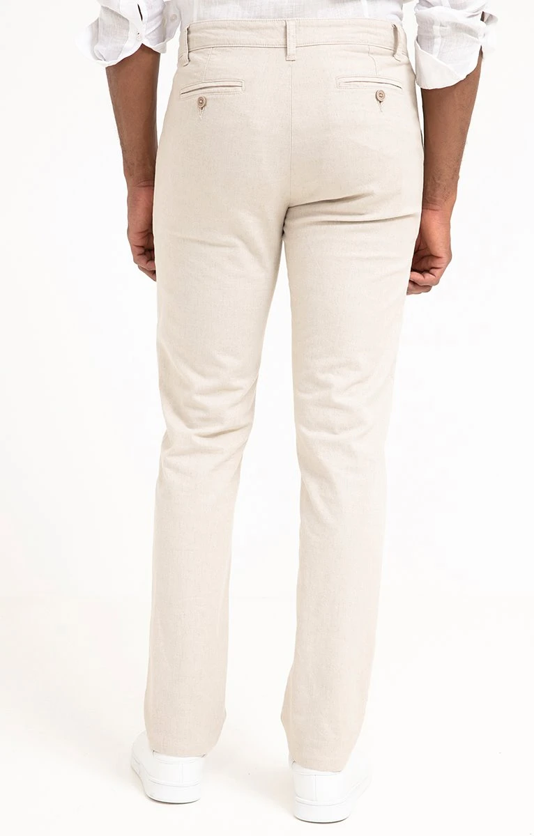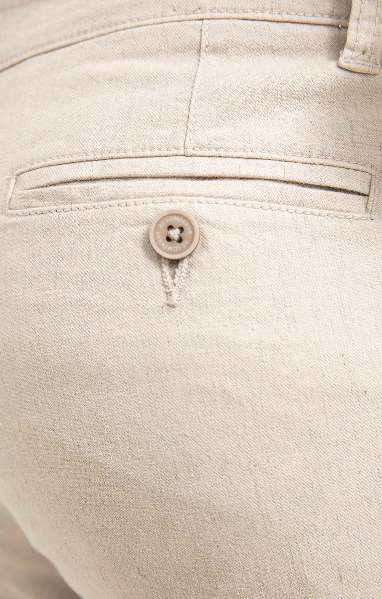Pantalon chino ajusté en coton et lin. Coupe ajustée. Forme chino. Fermeture par un zip et un bouton devant. 2 poches italiennes devant et une poche passepoilée sous la ceinture. 2 poches passepoilées boutonnées au dos. Coloris uni. Matière extensible. Passants pour ceinture. Coutures discrètes ton sur ton. Boutons gravés. Composition en coton majoritaire contenant du lin. Notre mannequin Marvin mesure 1m87 et porte un pantalon taille 42.