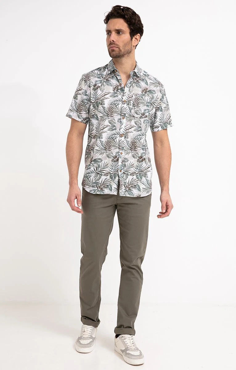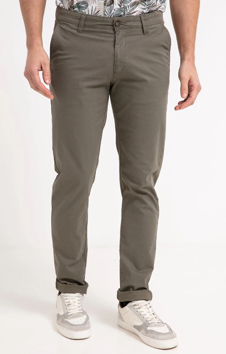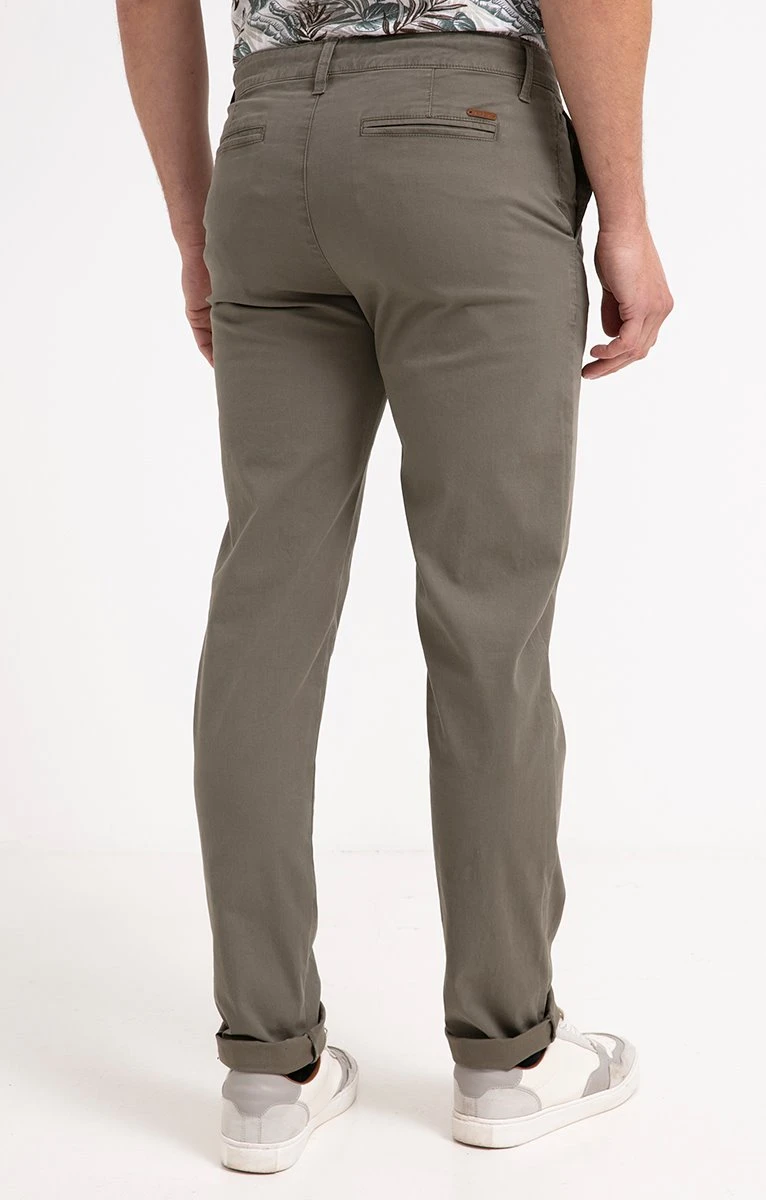 Pantalon chino slack uni style détente. Coupe ajustée. Longueur pied. Fermeture par zip recouvert et bouton imitation corne gravé. 2 poches italiennes devant et 2 poches passepoilées au dos. Tissu uni légèrement extensible. 5 passants pour ceinture. Micro étiquette marque cousue au-dessus de la poche au dos. Composition en coton majoritaire. Notre mannequin Marvin mesure 1m87 et porte un pantalon taille 42.