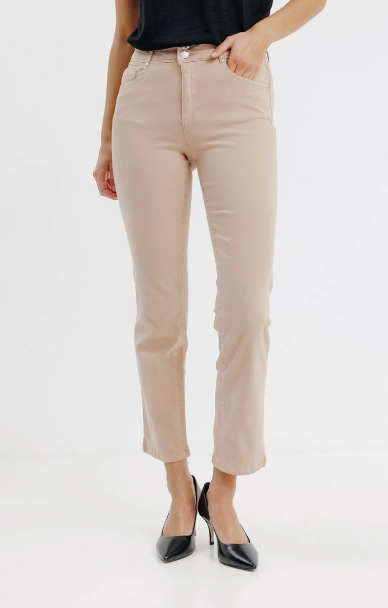Pantalon droit taille haute deux boutons détail strass. Coupe droite. Longueur 7/8. Taille haute. Zip recouvert et double bouton en métal brillant. 5 passants pour ceinture dont 2 avec rivets devant. 2 poches cavalières avec rivets rehaussées de clous métalliques et une poche ticket devant. 2 poches plaquées rivetées au dos. Coloris uni. Toile élastique ultrarésistante. Composition en coton majoritaire. Notre mannequin Laura mesure 1m78 et porte un pantalon taille 36.