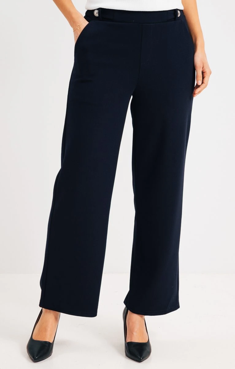 Pantalon large 7/8 en tissu extensible fermé par boutons sur patte devant. Coupe ample. Longueur 7/8. Fermeture par boutons métalliques fantaisie sur patte à la taille devant. 2 poches italiennes devant. Coloris uni. Matière extensible. Taille élastiquée au dos. Passants sur le devant de la taille. Notre mannequin Laura mesure 1m78 et porte un pantalon taille 36.