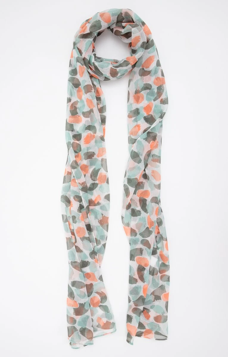 Long foulard tacheté rehaussé de paillettes brillantes. Forme étole rectangulaire. Tissu fin semi-transparent. Imprimé multicolore, motifs taches au pinceau sur l’ensemble. Petites paillettes brillantes. Finitions ourlées. Délicatement coloré et rehaussé de petits points brillants, ce long foulard est idéal dans l’encolure d’un trench ou d’un pull en V.