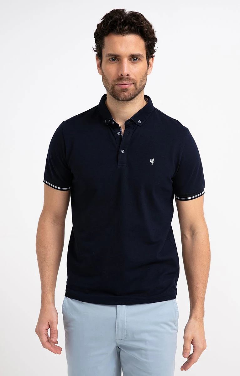 Polo en coton stretch uni à manches courtes. Coupe ajustée. Manches courtes avec bordure rayée. Col avec pointes boutonnées. Fermeture à boutons. Coloris uni. Tissu en maille piquée. Matière extensible. Détails en tissu fleuri sur le revers du col, le pied de l’encolure et la patte de boutonnage. Mini logo brodé contrastant sur la poitrine. Base droite. Composition en coton majoritaire. Notre mannequin Joffrey mesure 1m88 et porte un polo taille M.
