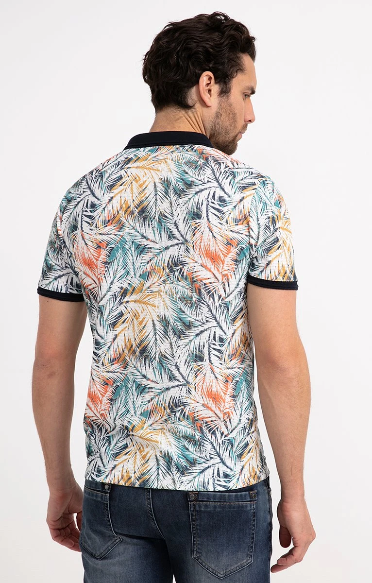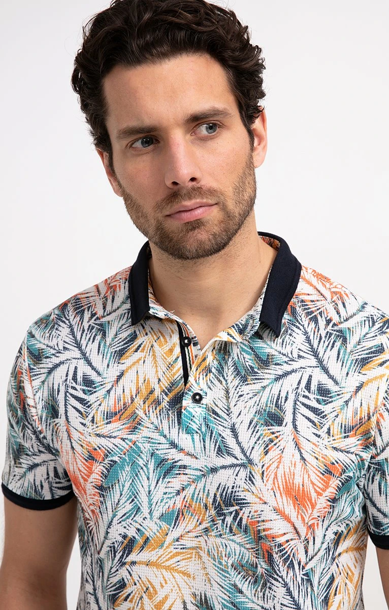 Polo imprimé feuillage à manches courtes. Coupe ajustée. Manches courtes avec finition bord-côte. Col polo côtelé. Encolure boutonnée. Motif grand feuillage multicolore en toile de fond avec feuillage monochrome en surimpression. Modèle en maille piquée. Tissu extensible. Bas des manches et encolure en tissu uni contrastant. Base droite. Notre mannequin Joffrey mesure 1m88 et porte un polo taille M.