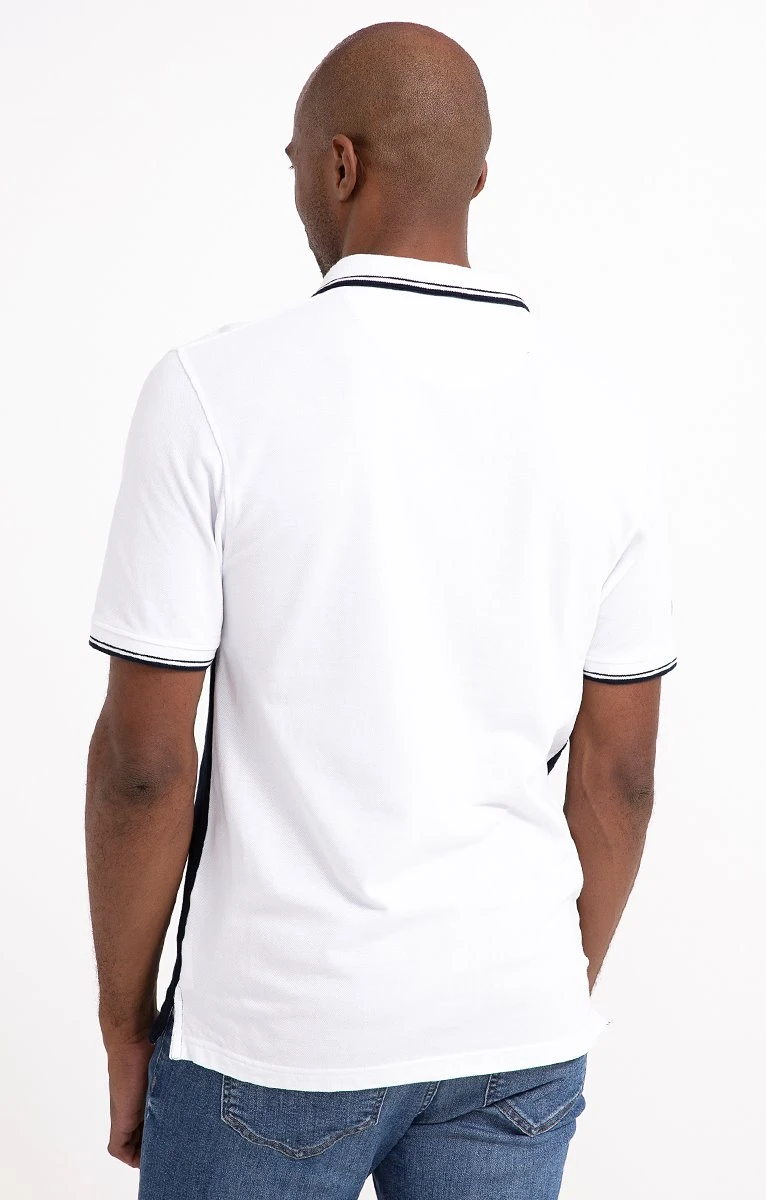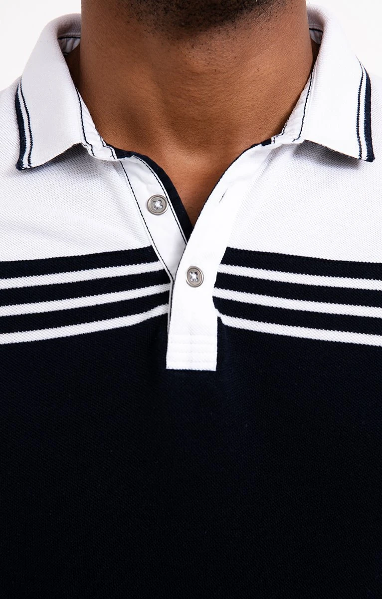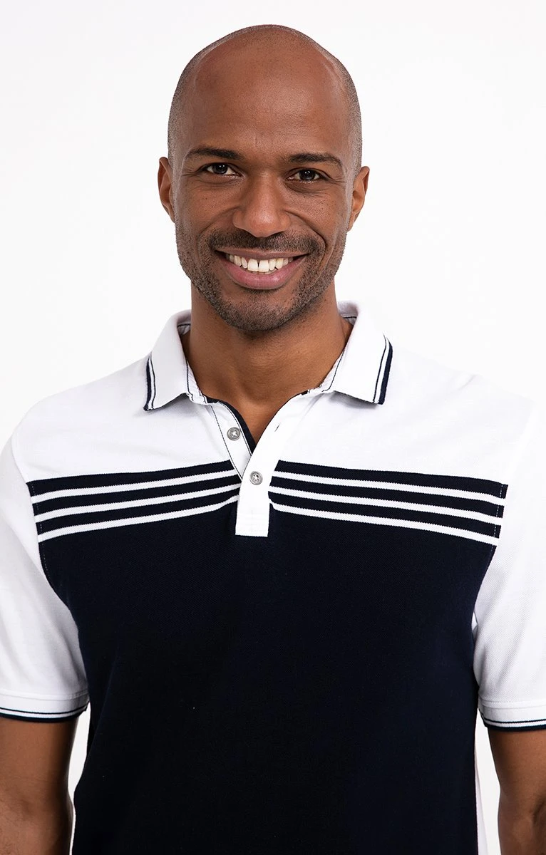 Polo en coton avec rayures placées devant. Coupe droite. Manches courtes. Col polo avec dessous de l’encolure contrastant. Fermeture boutonnée. Polo effet patchwork devant avec rayures placées sur la poitrine. Dos uni contrastant. Maille piquée. Broderie contrastante sur une manche. Finitions à rayures assorties à l’encolure et aux manches. Base droite avec petites fentes sur les côtés. Composition 100% coton. Notre mannequin Marvin mesure 1m87 et porte un polo taille M.