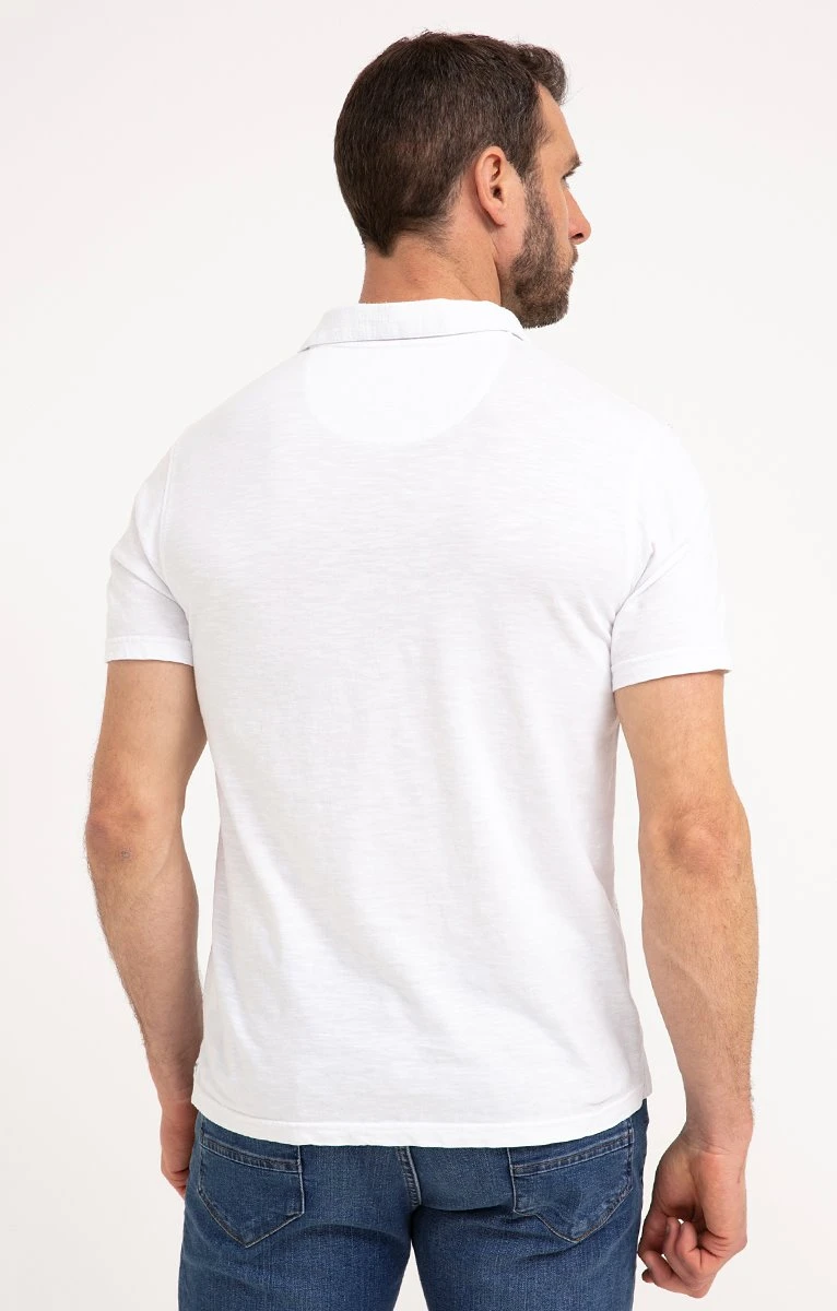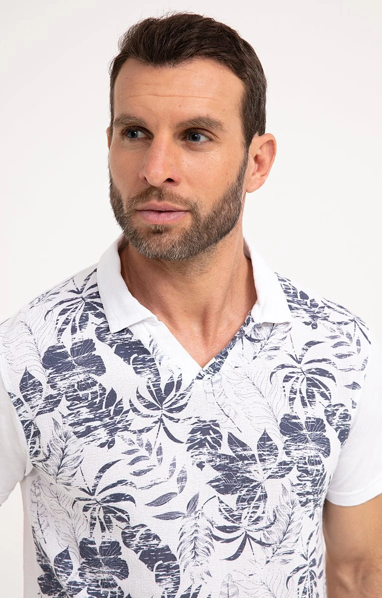 Polo col V et manches courtes en coton imprimé. Coupe droite. Manches courtes. Col polo uni en V, sans boutons. Imprimé à motif feuillage sur fond uni devant. Tissu texturé esprit résille sur le devant. Manches et dos unis. Coutures discrètes ton sur ton en finition. Composition 100 % coton. Notre mannequin Nicolas mesure 1m87 et porte un polo taille M.