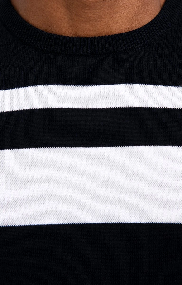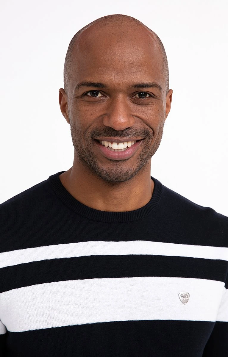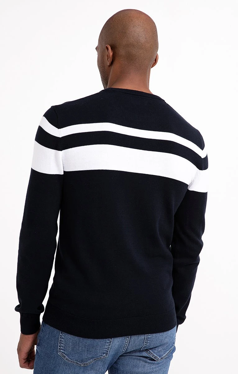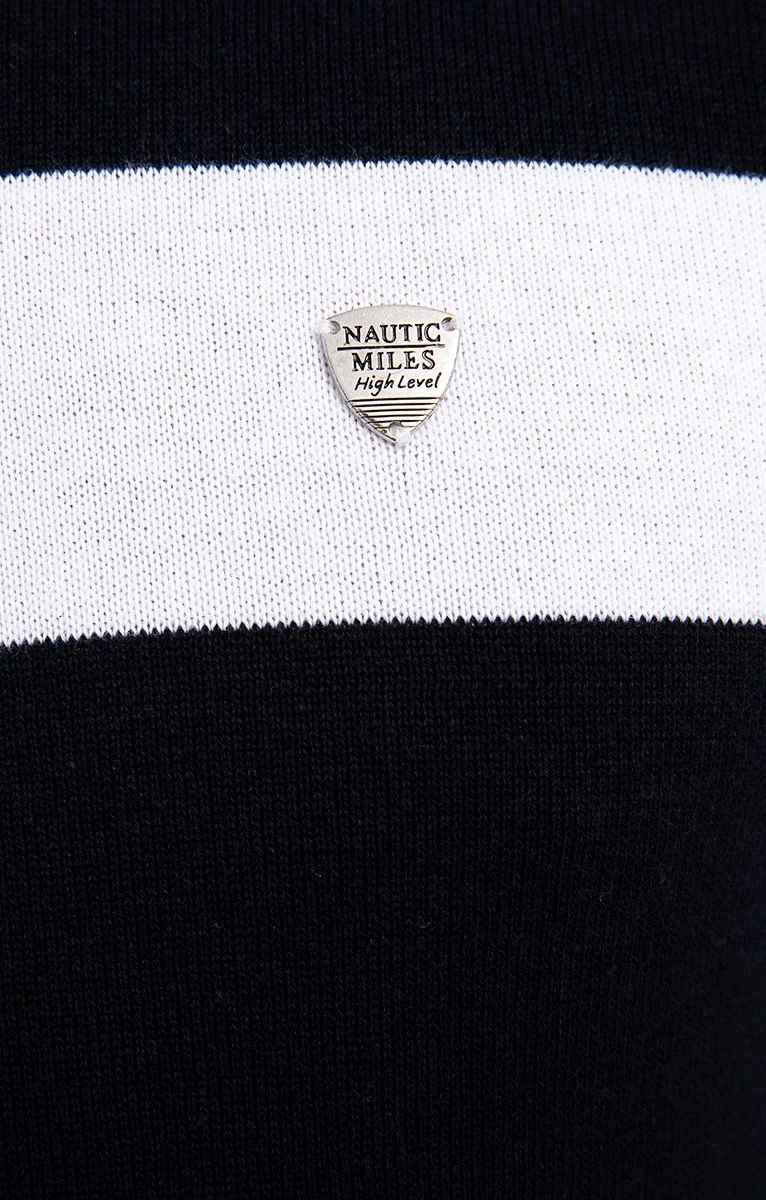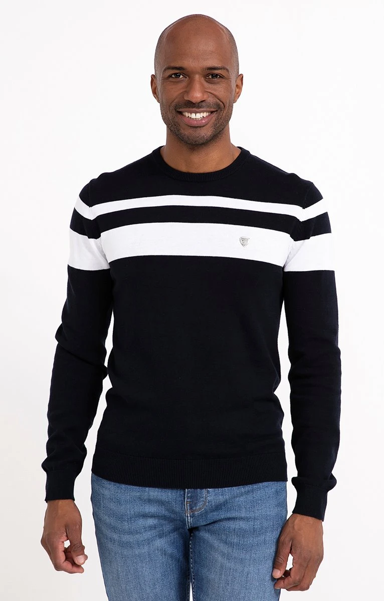 Pull en coton avec rayures contrastées sur le haut. Coupe droite. Manches longues. Col rond. Pull fin en maille jersey orné de 2 rayures contrastées sur la poitrine, le haut des manches et dans le dos. Plaque triangulaire en métal gravée et cousue sur la poitrine. Finitions extensibles en fines côtes sur le col, les poignets et le bas. Composition 100 % coton. Notre mannequin Marvin mesure 1m87 et porte un pull taille M.