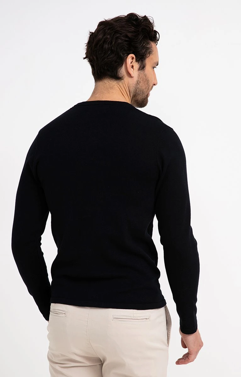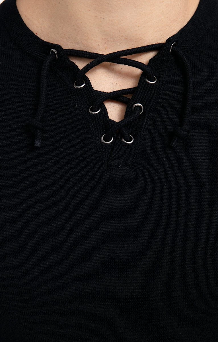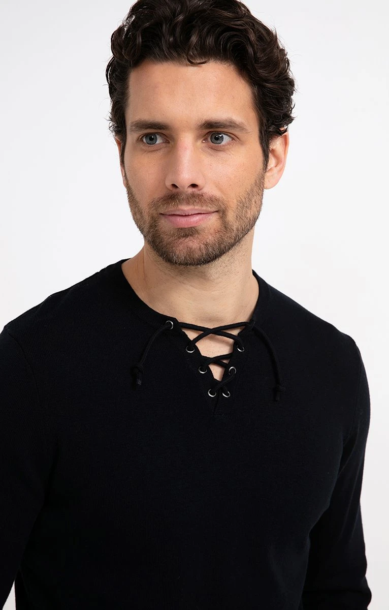 Pull à manches longues et col lacé tricoté en coton et polyester recyclé. Coupe légèrement ajustée. Manches longues. Emmanchures droites. Col esprit tunisien. Fermeture par cordon glissé dans des œillets métalliques. Teinte unie. Maille jersey fine. Base droite. Composition en coton mélangé et contenant du polyester recyclé. Notre mannequin Joffrey mesure 1m88 et porte un pull taille M.