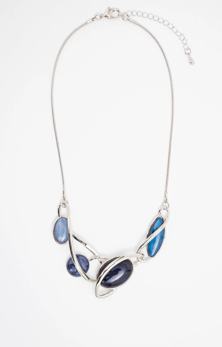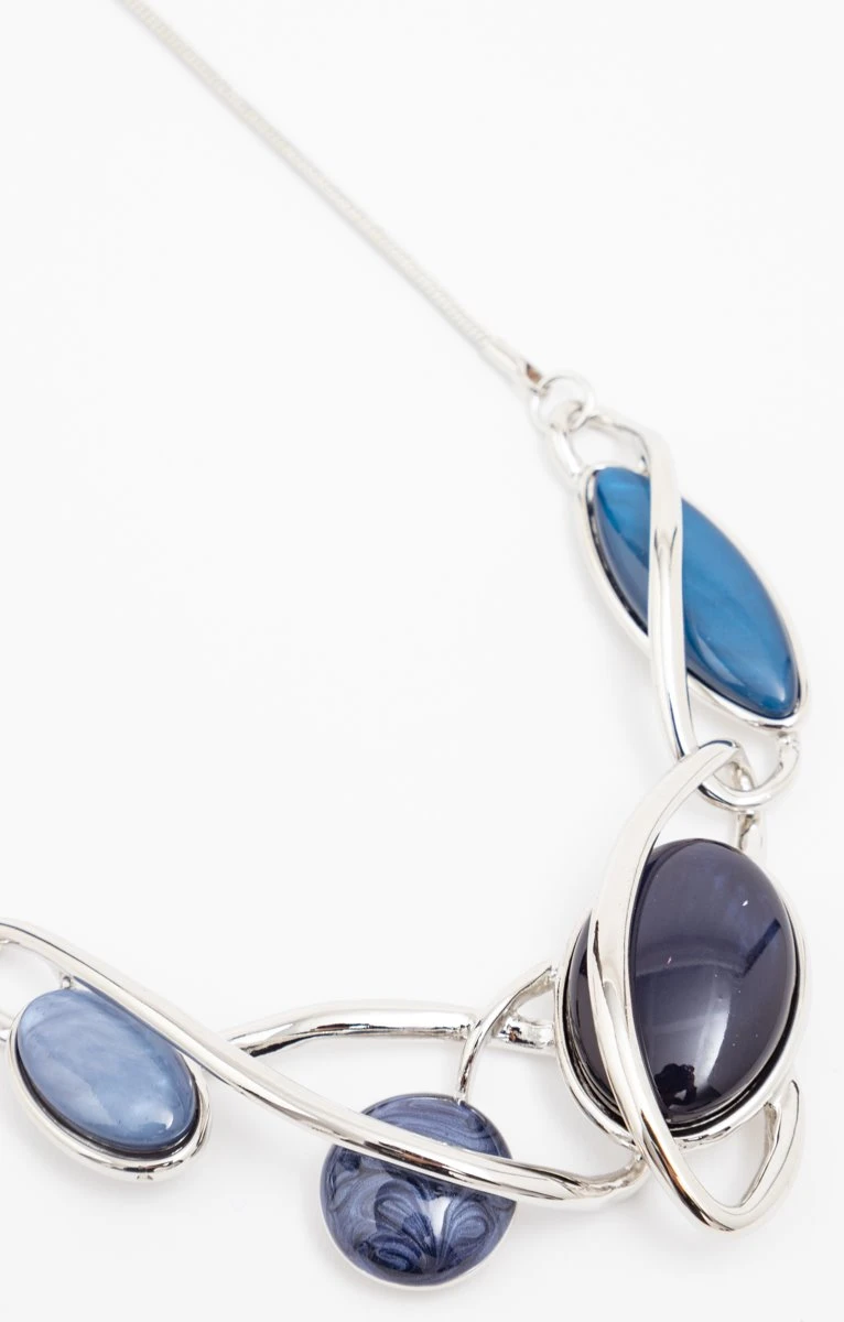 Collier plastron en métal argenté avec gros cabochons en camaïeu de couleurs. Forme ras de cou. Chaîne fine maille serpent finition argentée. Parure fixe en métal brillant à motifs entrelacés rehaussés de cabochons ovales et ronds avec pierres fantaisie en camaïeu. Fermoir mousqueton avec chaîne d’extension. Composition garantie sans nickel. Existe aussi en version métal doré avec pierres de couleur assortie.