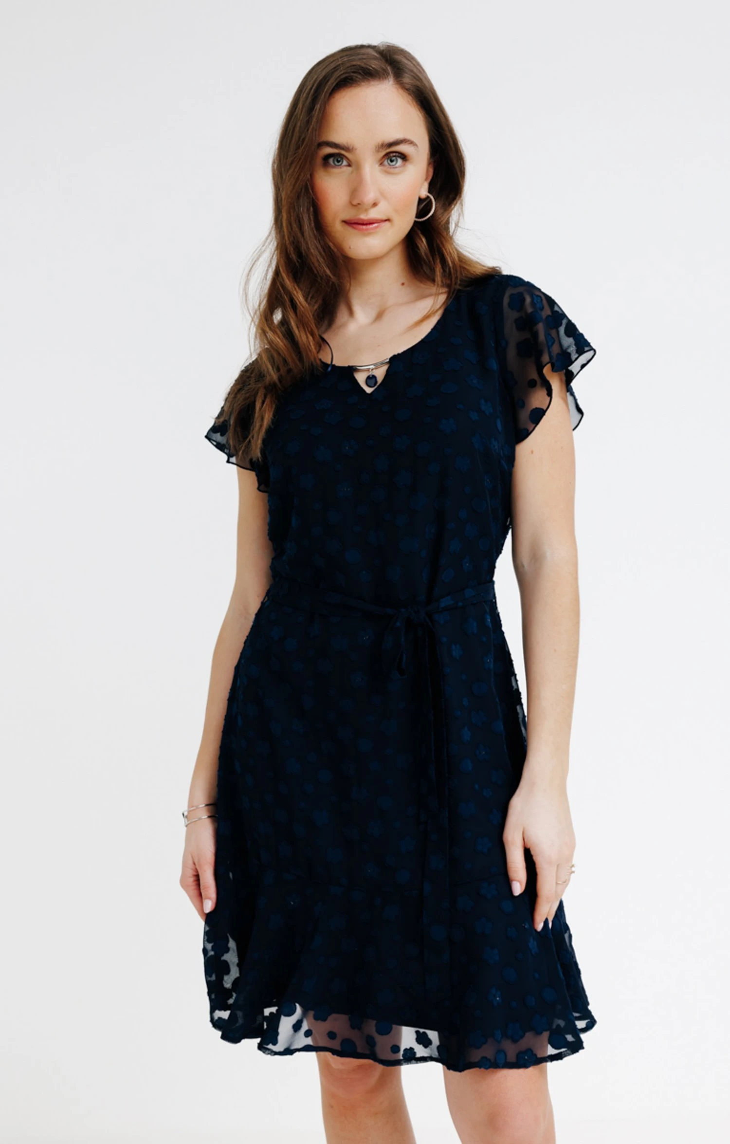 Robe en voile jacquard avec bijou sur le col. Coupe resserrée à la taille par une ceinture à nouer. Volant évasé sur le bas. Longueur genou. Manches courtes volantées. Col rond avec ouverture en V fermée par un bijou en métal avec pendentif. Robe confectionnée en voile jacquard présentant un motif de fleurs et cercles tissés ton sur ton. Doublure opaque. Manches non doublées. Notre mannequin Pauline mesure 1m73 et porte une robe taille 38.