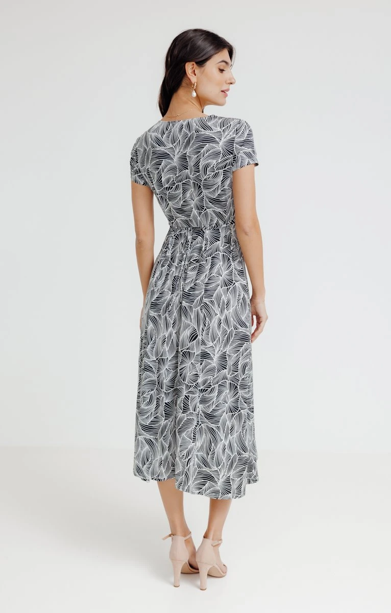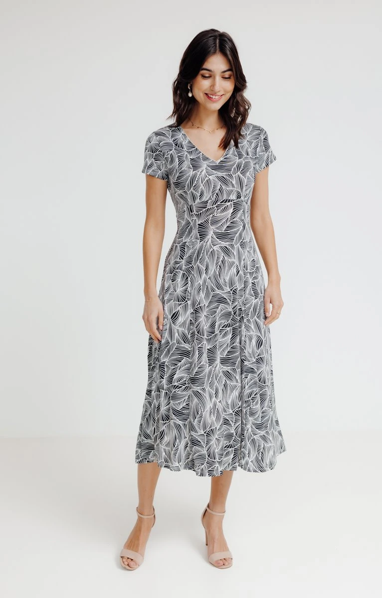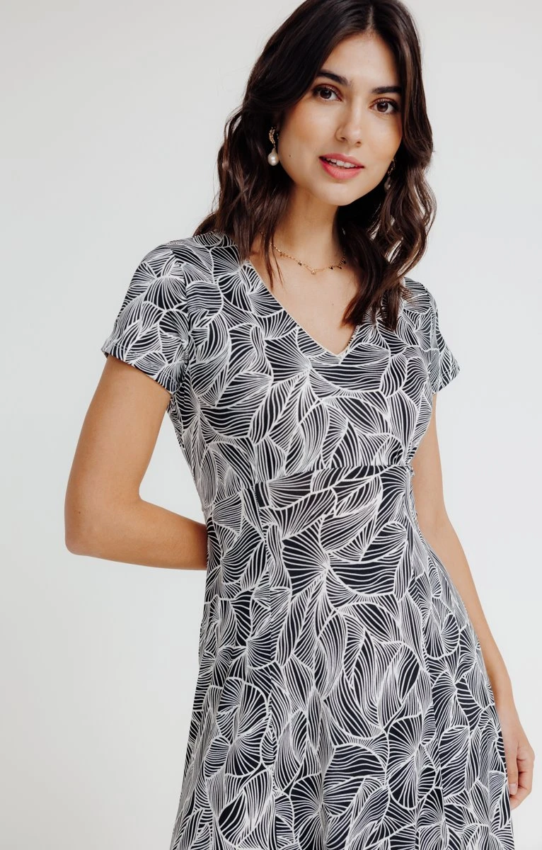 Robe longue imprimée. Coupe empire. Longueur mi-mollet (125 cm). Manches courtes à emmanchures droites. Col V. Imprimé à motifs feuilles sur l’ensemble du modèle. Bicolore. Matière extensible. Fine ceinture ton sur ton à nouer dans le dos pour cintrer la robe. Coutures discrètes en finition. Notre mannequin Laura mesure 1m78 et porte une robe taille 38.