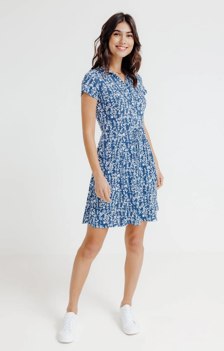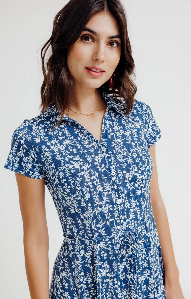 Robe chemise imprimée. Coupe droite à cintrer par une fine ceinture à nouer sur la taille. Longueur au-dessus du genou. Manches courtes à emmanchures droites. Col de chemise classique. Fermeture boutonnée sur le devant. Imprimé à motif végétal sur fond uni, sur l’ensemble de la robe. Traits en relief sur les motifs. Matière extensible. Notre mannequin Laura mesure 1m78 et porte une robe taille 38.