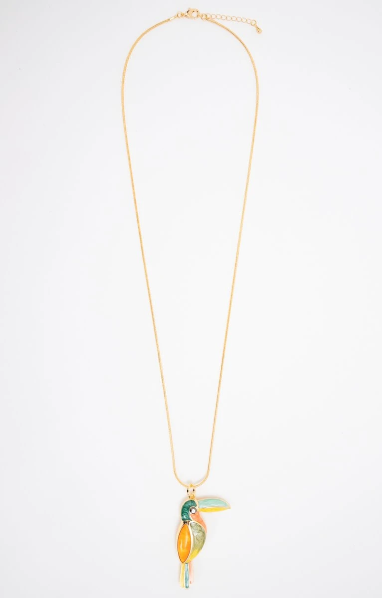 Sautoir fantaisie doré avec pendentif toucan multicolore. Forme sautoir. Chaîne en maille serpent fine. Pendentif toucan avec sertissage façon pierres nacrées multicolores. Détail pierre à facettes contrastante au niveau de l’œil. Fermoir mousqueton. Chaîne de rallonge en maille forçat avec embout perle goutte d’eau. Collier aux finitions dorées. Composition garantie sans nickel.