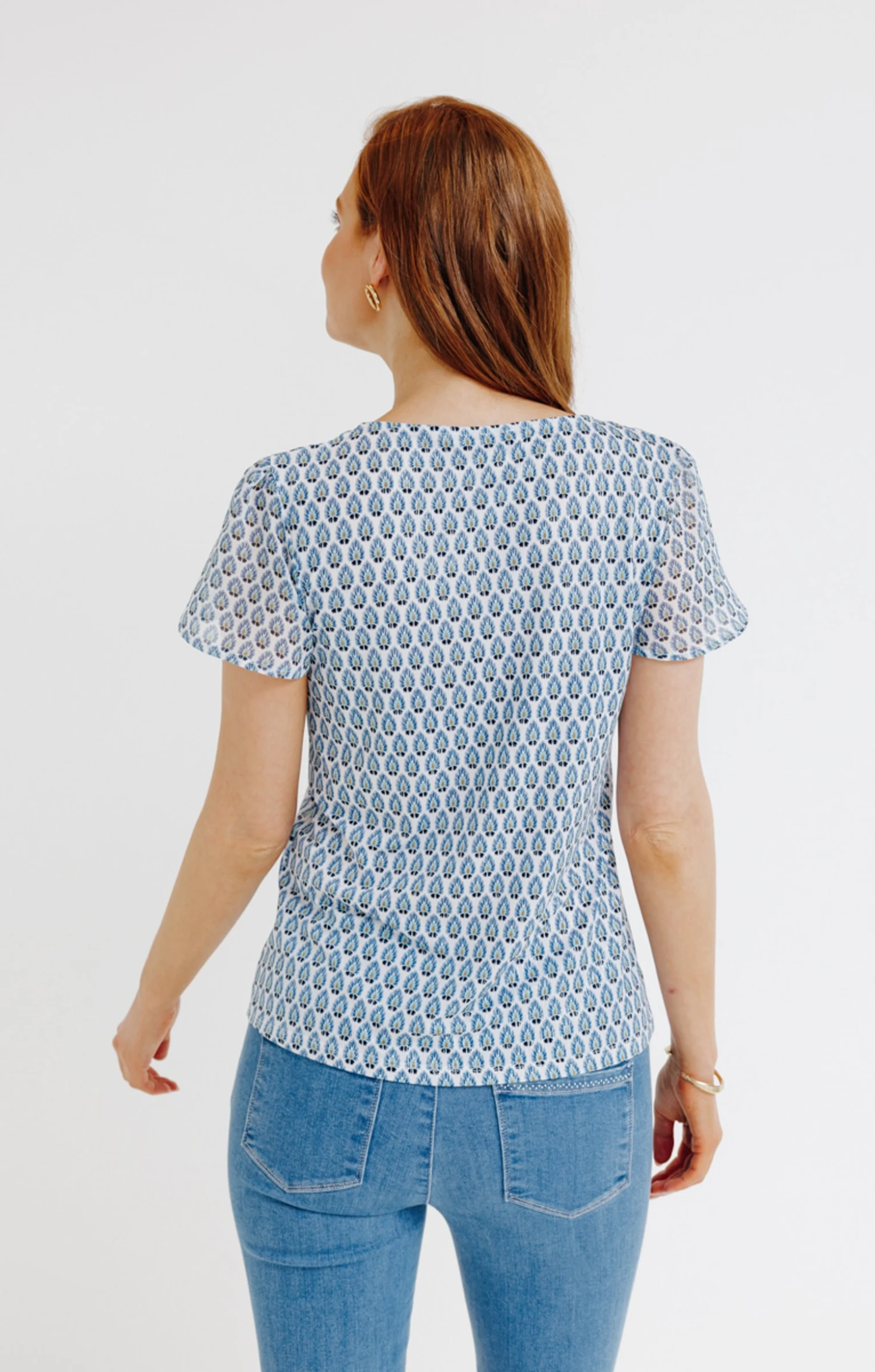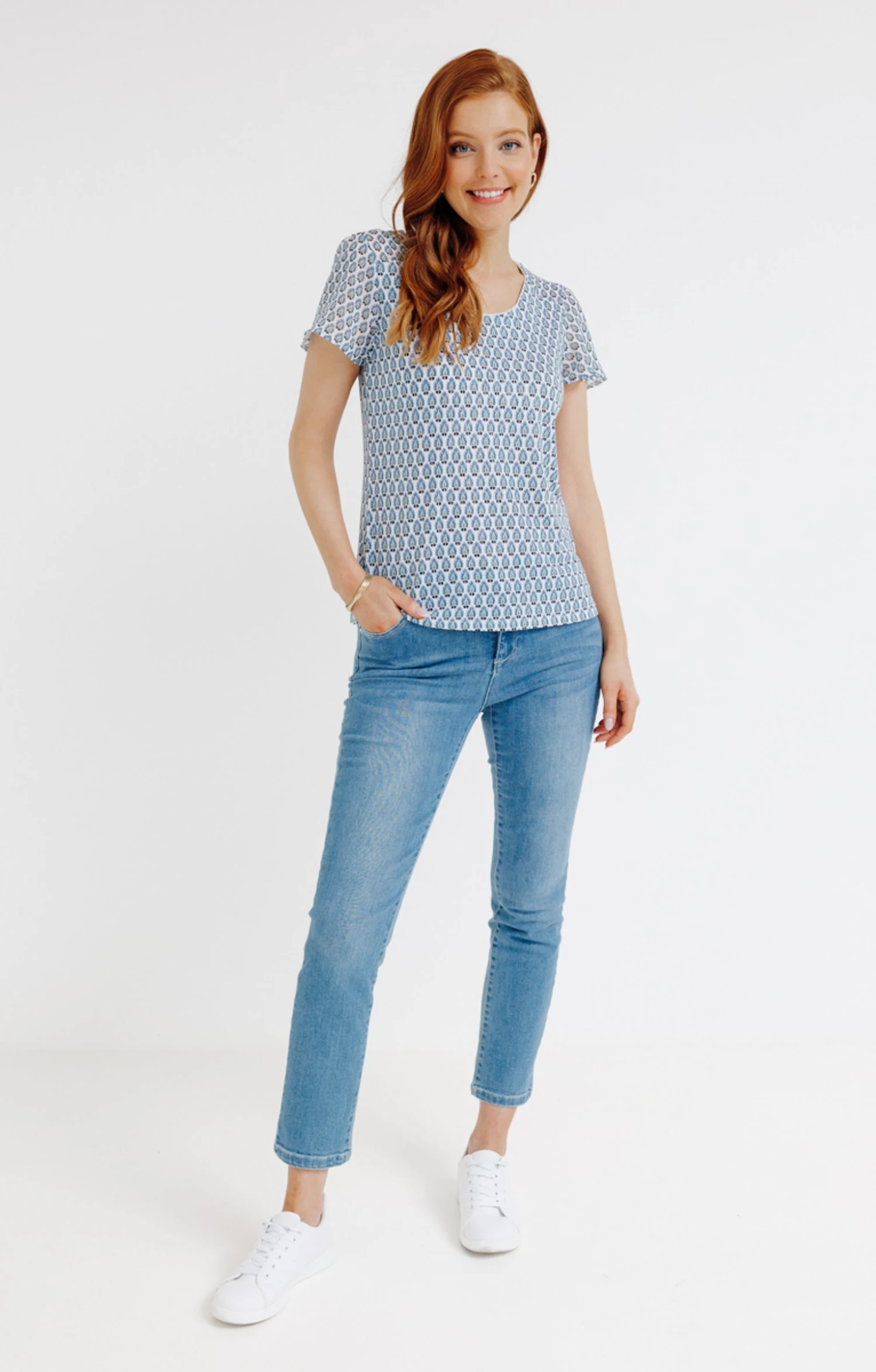 T-shirt à motifs ikat. Coupe droite. Manches courtes à emmanchures droites. Légères fronces au niveau des emmanchures. Col rond bordé d’un liseré métallisé. Imprimé à motifs ikat sur fond à fines rayures métallisées. Matière extensible. Portez ce t-shirt au motif original avec un jean et des baskets. Notre mannequin Anna mesure 1m80 et porte un t-shirt taille 1.