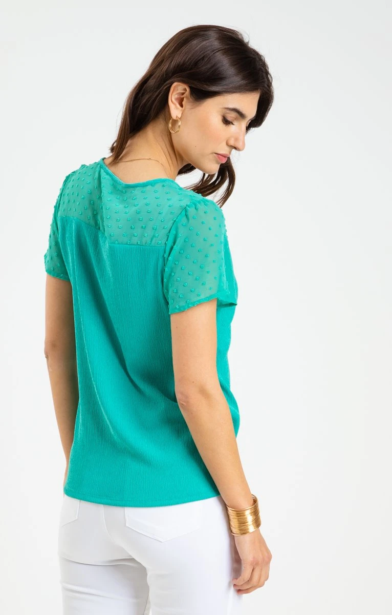 T-shirt uni avec manches en plumetis. Coupe droite. Manches courtes à emmanchures droites en plumetis. Décolleté en V structuré. Coloris uni. Matière extensible texturée. Empiècement en plumetis dans le haut du dos. Coutures discrètes ton sur ton en finition. Associez ce t-shirt élégant à un jean 7/8 et des baskets basses. Notre mannequin Anna mesure 1m80 et porte un t-shirt taille 1.