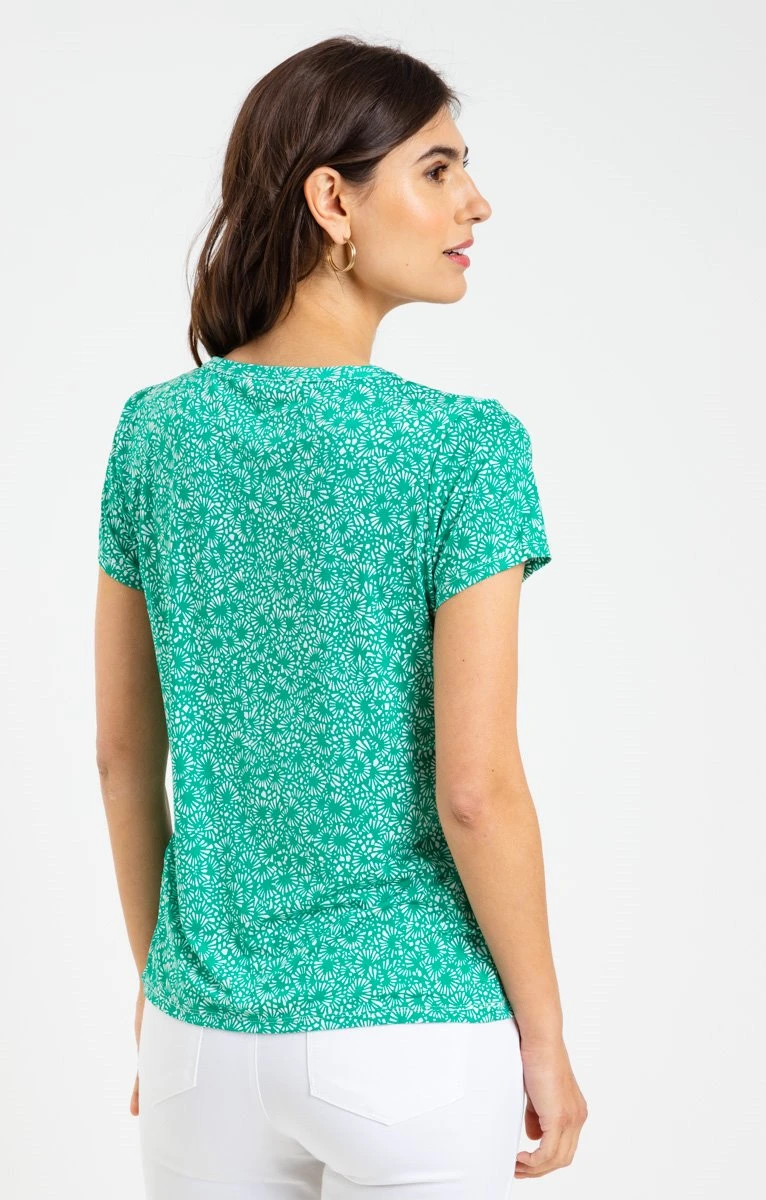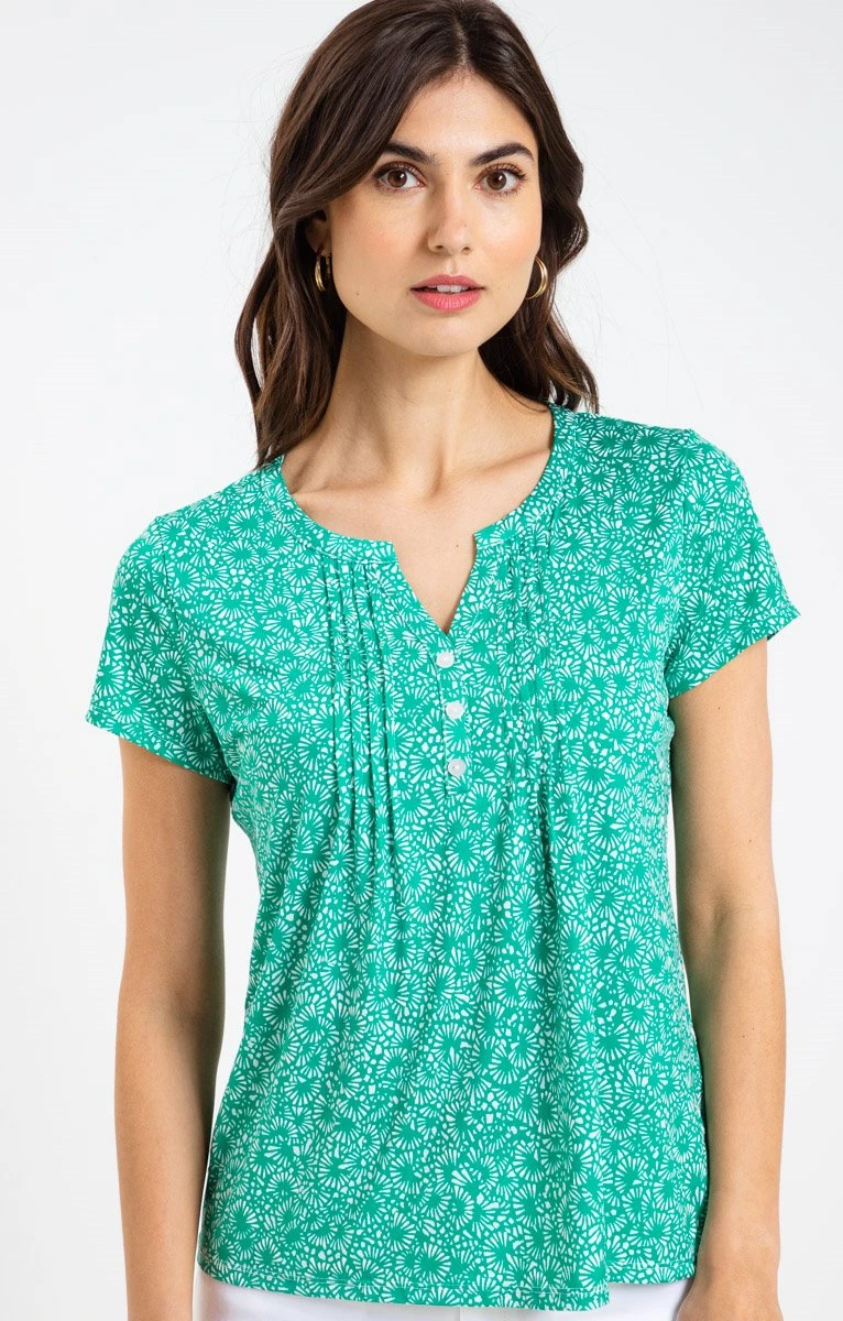 T-shirt imprimé avec détails plissés. Coupe droite. Manches courtes à emmanchures droites. Col mao fermé par 3 boutons. Imprimé à motif esprit floral sur fond uni, sur l’ensemble du modèle. Bicolore. Détails en relief. Matière extensible. Plis verticaux de part et d’autre du col. Coutures discrètes en finitions. Notre mannequin Laura mesure 1m78 et porte une blouse taille 1.