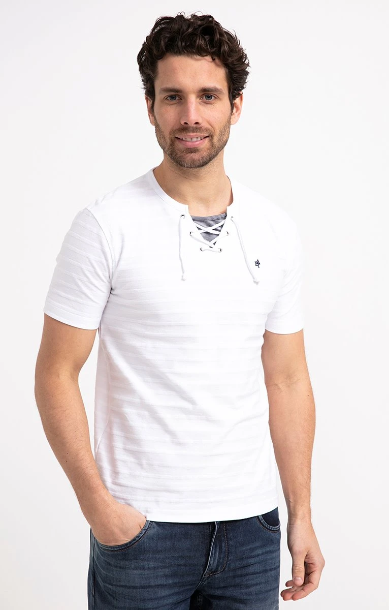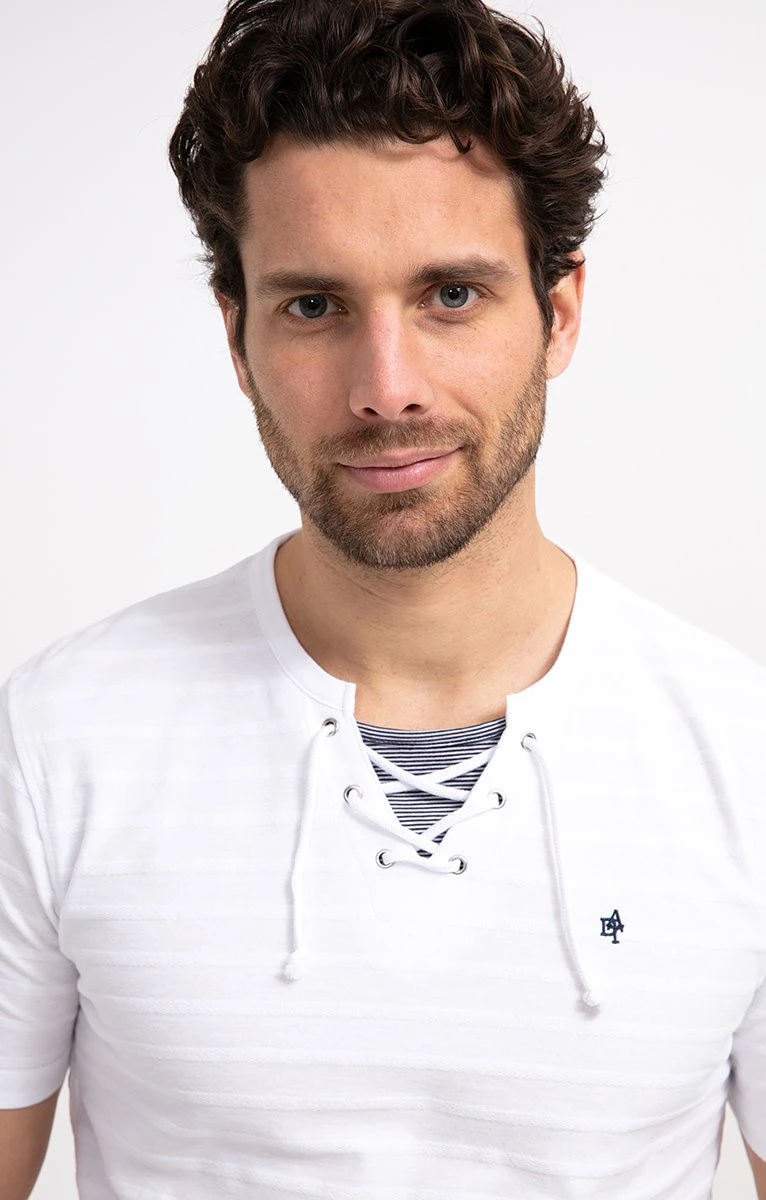 T-shirt en coton bio uni à manches courtes et col lacé. Coupe ajustée. Manches courtes. Col lacé avec doublure rayée. Coloris uni. T-shirt en maille texturée effet rayé. Mini logo contrastant brodé sur la poitrine. Œillets métalliques et cordon avec embouts noués. Base droite. Composition 100% coton biologique. Notre mannequin Joffrey mesure 1m88 et porte un t-shirt taille M.